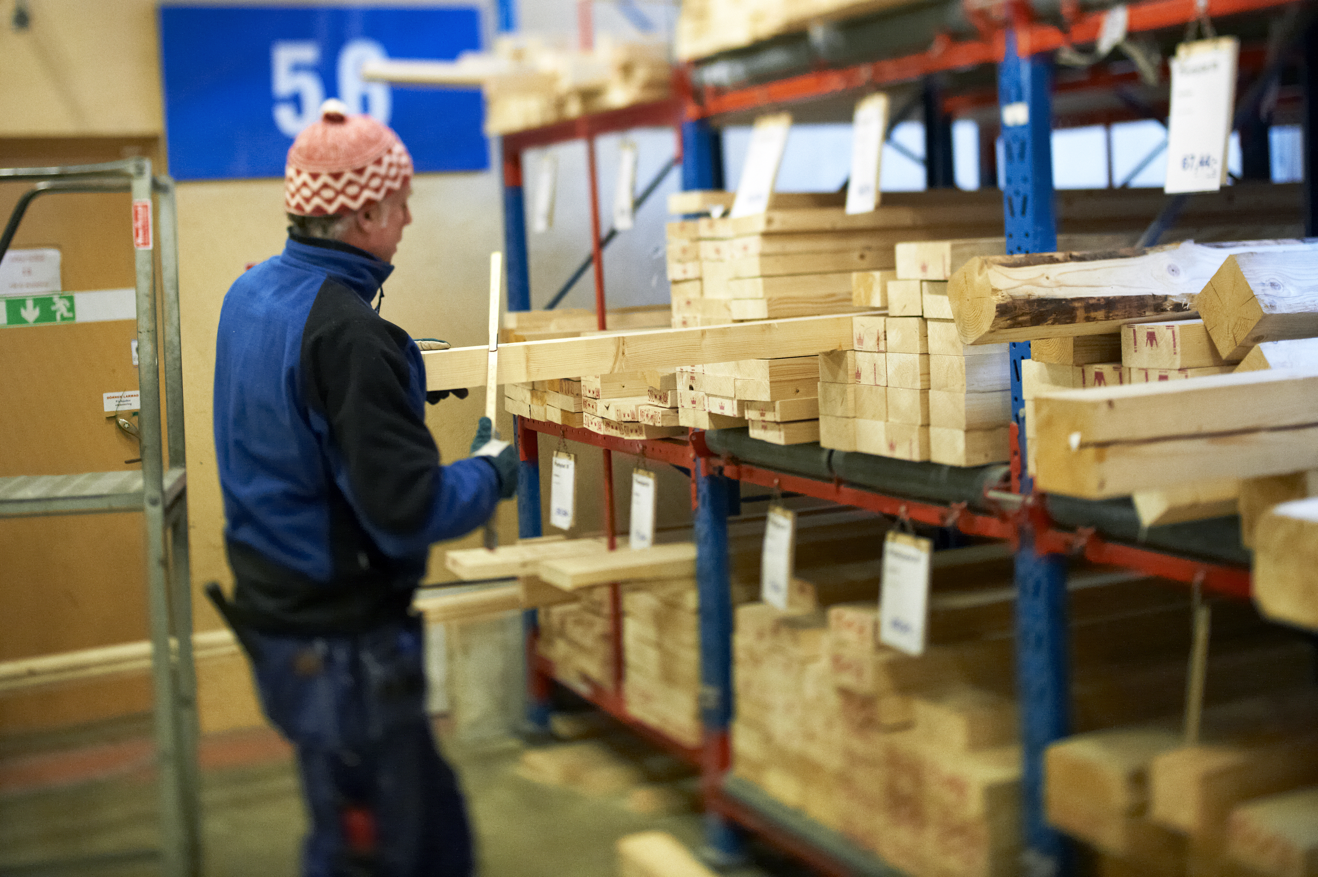 - Beskrivning: Fredells byggvaruhus, brädgård. Virke, plankor, brädor.