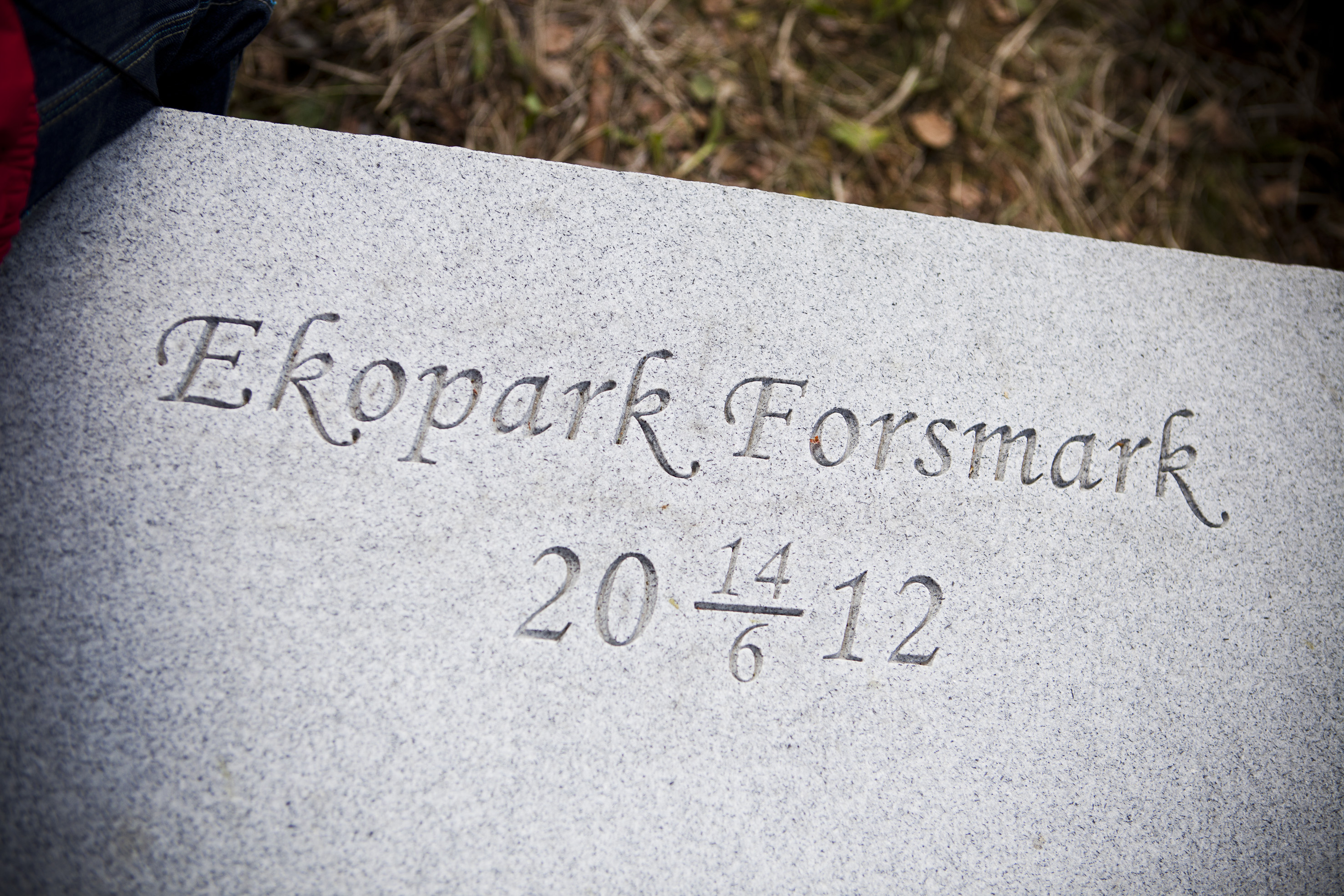 - Beskrivning: Närbild på bänken i ekoparken, i granit. Datum för invigningen är graverat. Ekopark Forsmark.