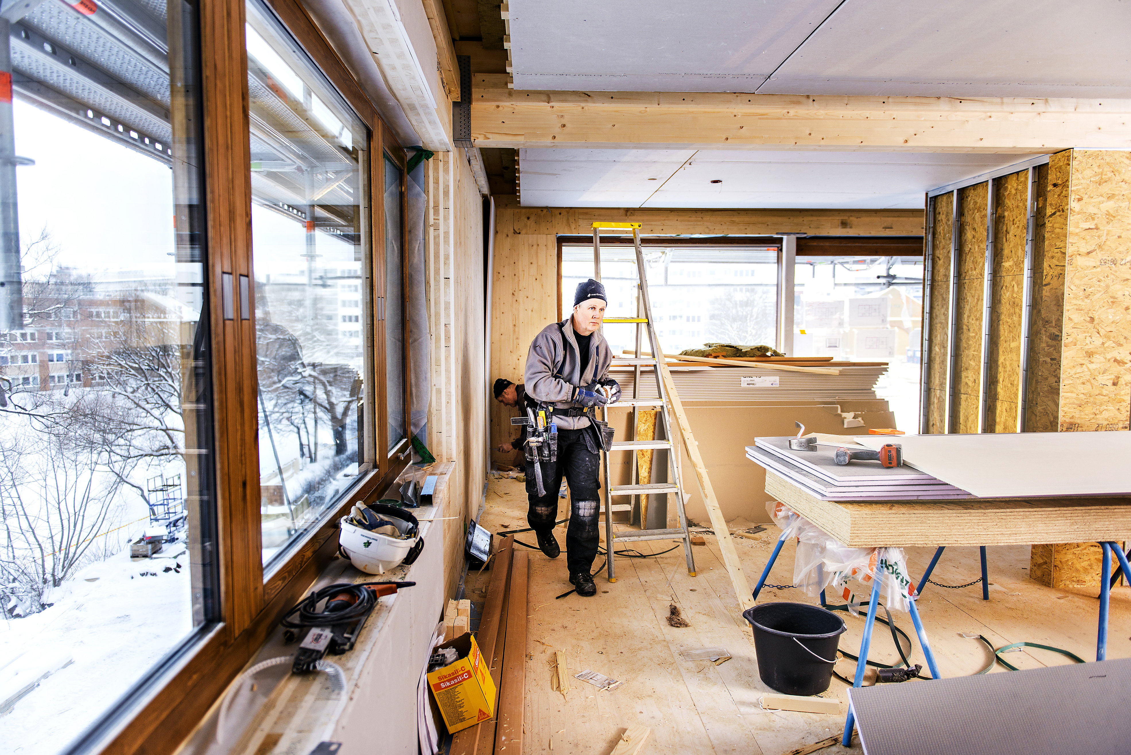 - Beskrivning: Folkhems sexvåningshus i trä som byggs i Strandparken i Sundbyberg utanför Stockholm.