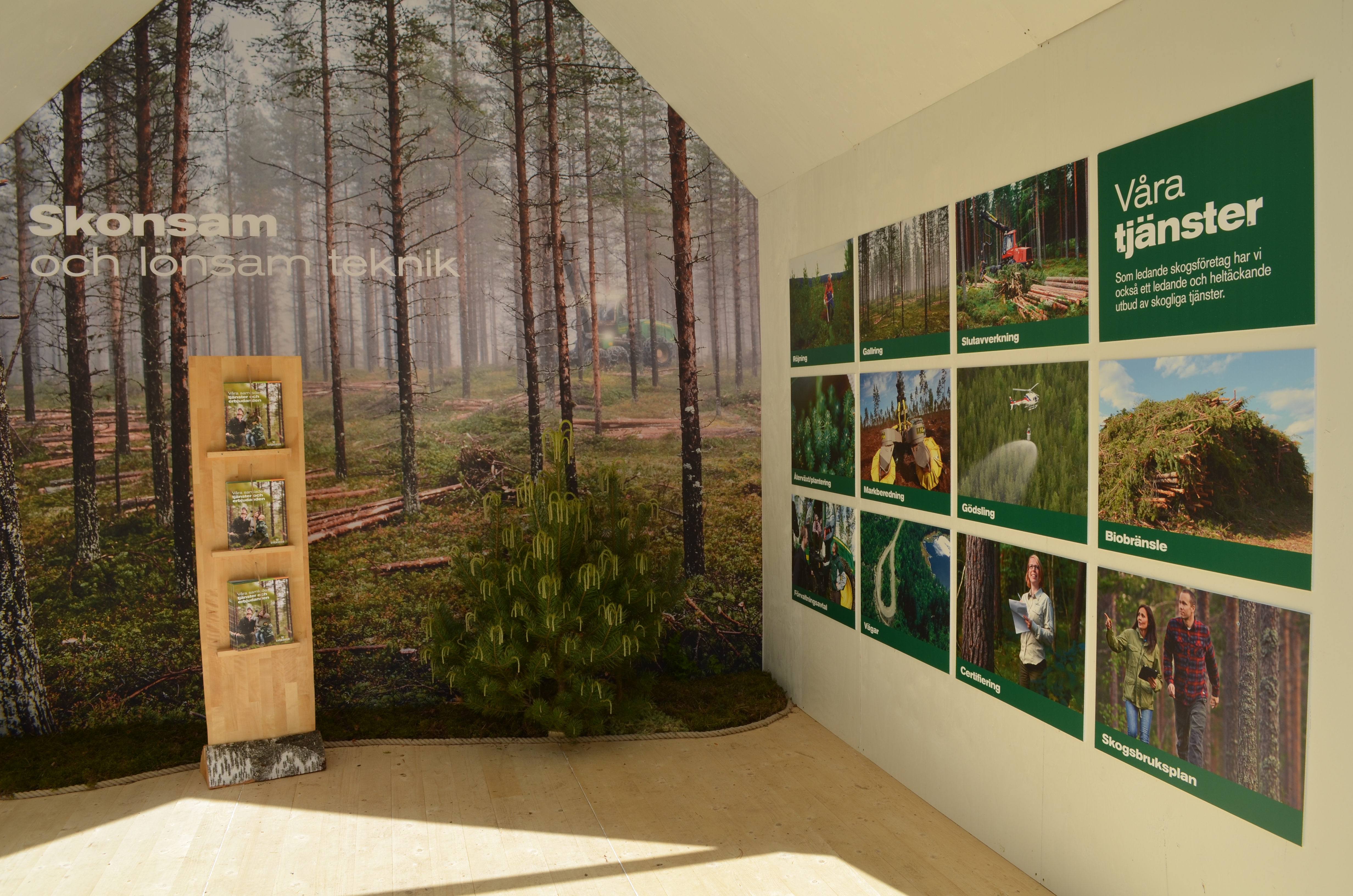 - Beskrivning: Sveaskogs medverkan på Elmia-mässan, Elmia Wood, våra virkesköpare, marknadsföring, monter, Sveaskogs montrar, skonsam och lönsam teknik, affischering