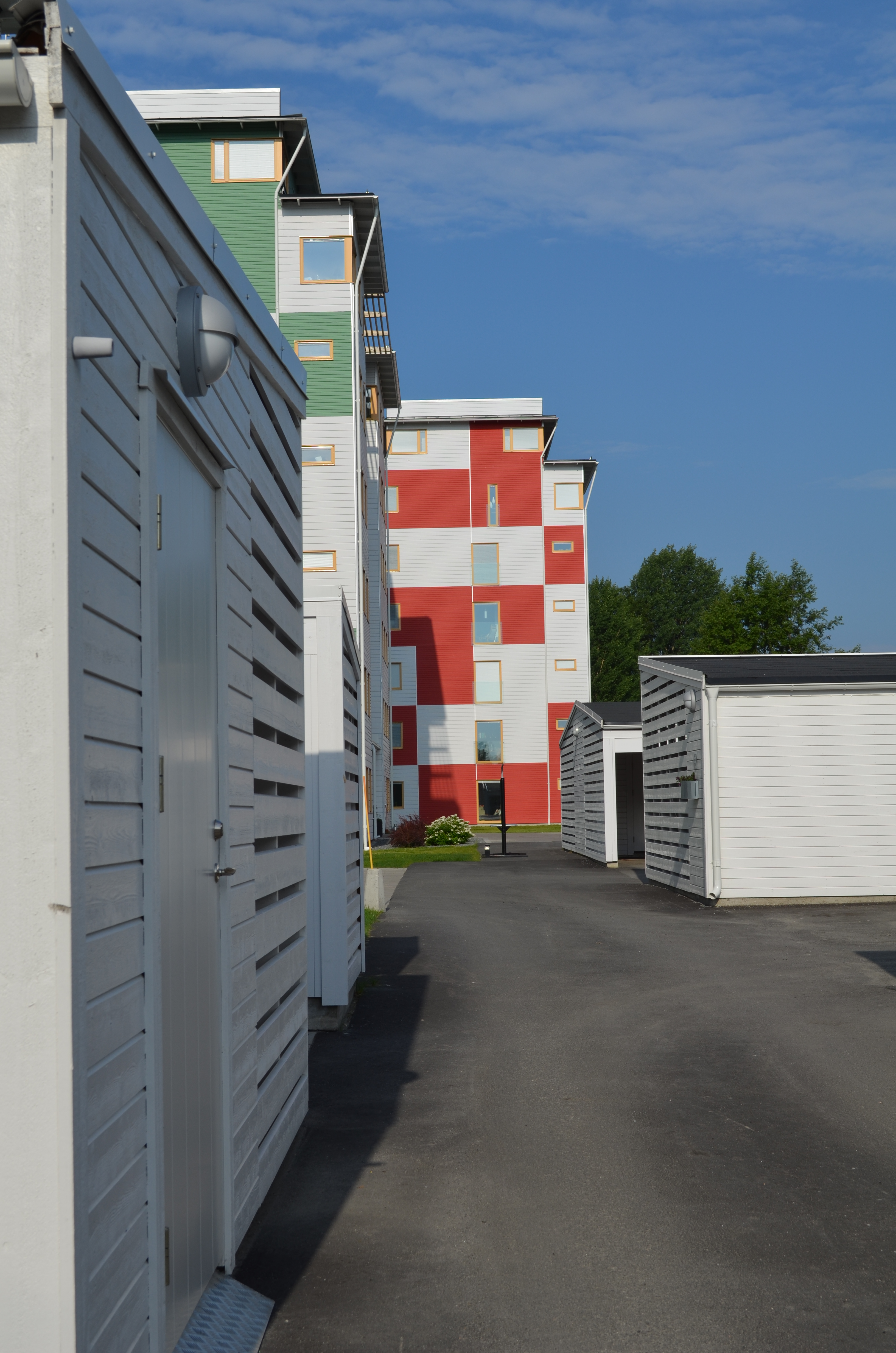 - Beskrivning: Samarbete mellan Sveaskog och Martinsons, träbyggnation, trähus, produkter och tjänster, slutanvändning av träråvara, bostad, lägenhet, limträpanel, Miljöbyggnad guld, Martinsons, bostadsområde.