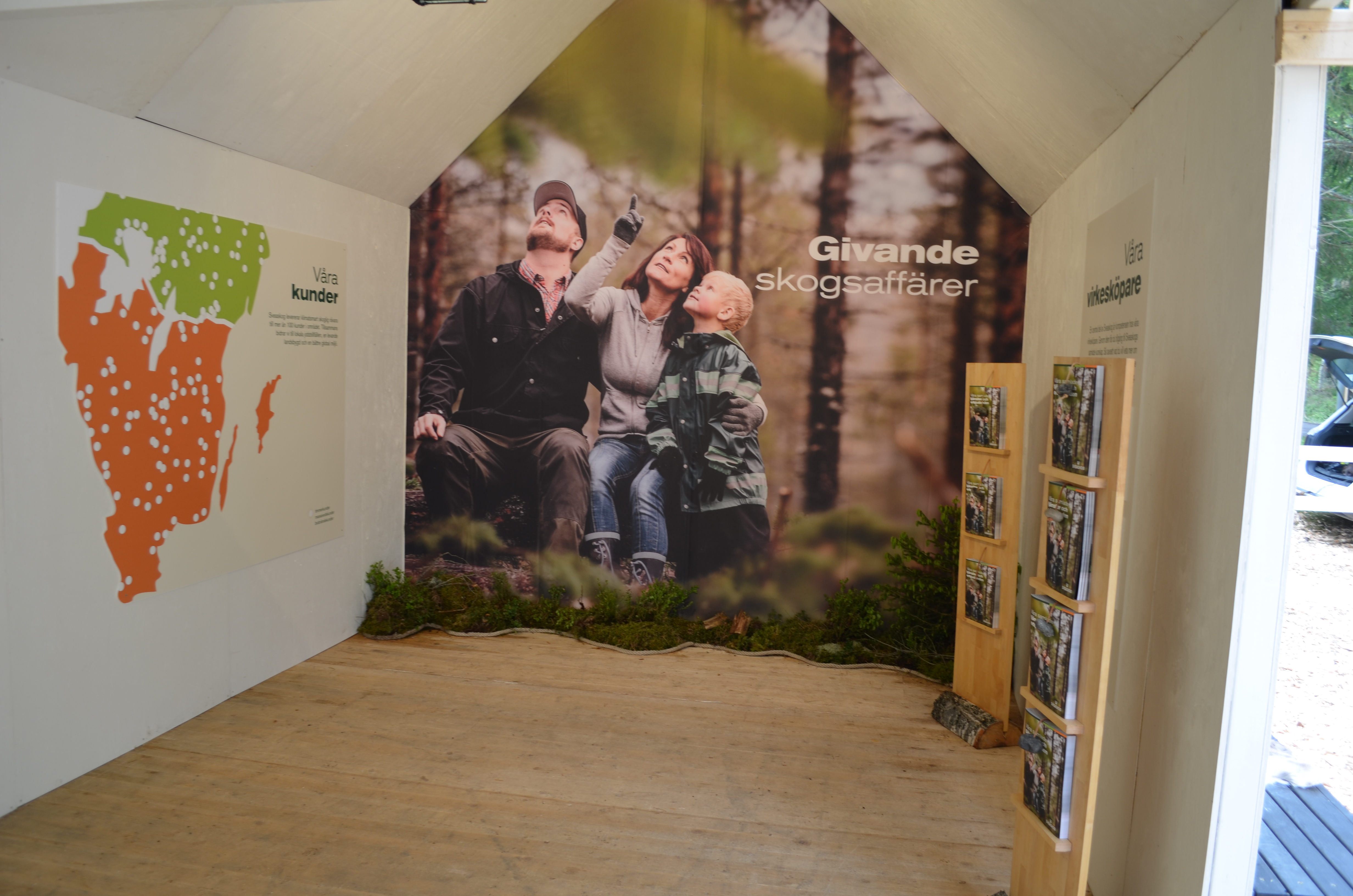 • Beskrivning: Del av Sveaskog monter, annonser, marknadsföring, Sveaskog på SkogsElmia, skogsmässa, jönköping,