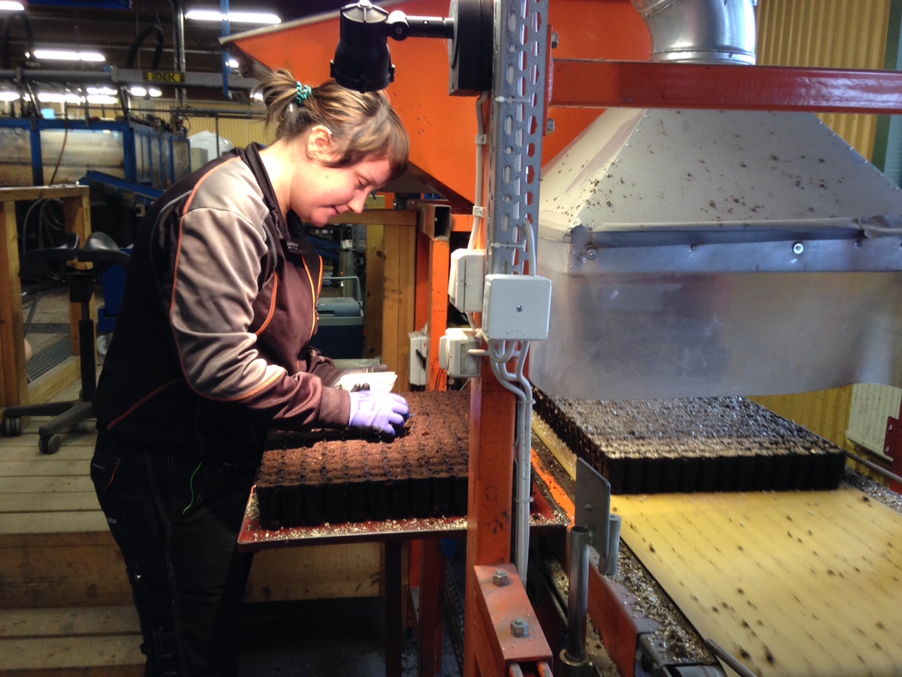 • Beskrivning: På Stakhedens plantskola sköter Jennifer Wiberg om såddmaskinen. Arbetet innebär bl a att med jämna mellanrum kontrollera maskinens exakthet, vilket innebär noll tomma krukor och så få dubbelsidiga som möjligt, med eventuell justering som följd.