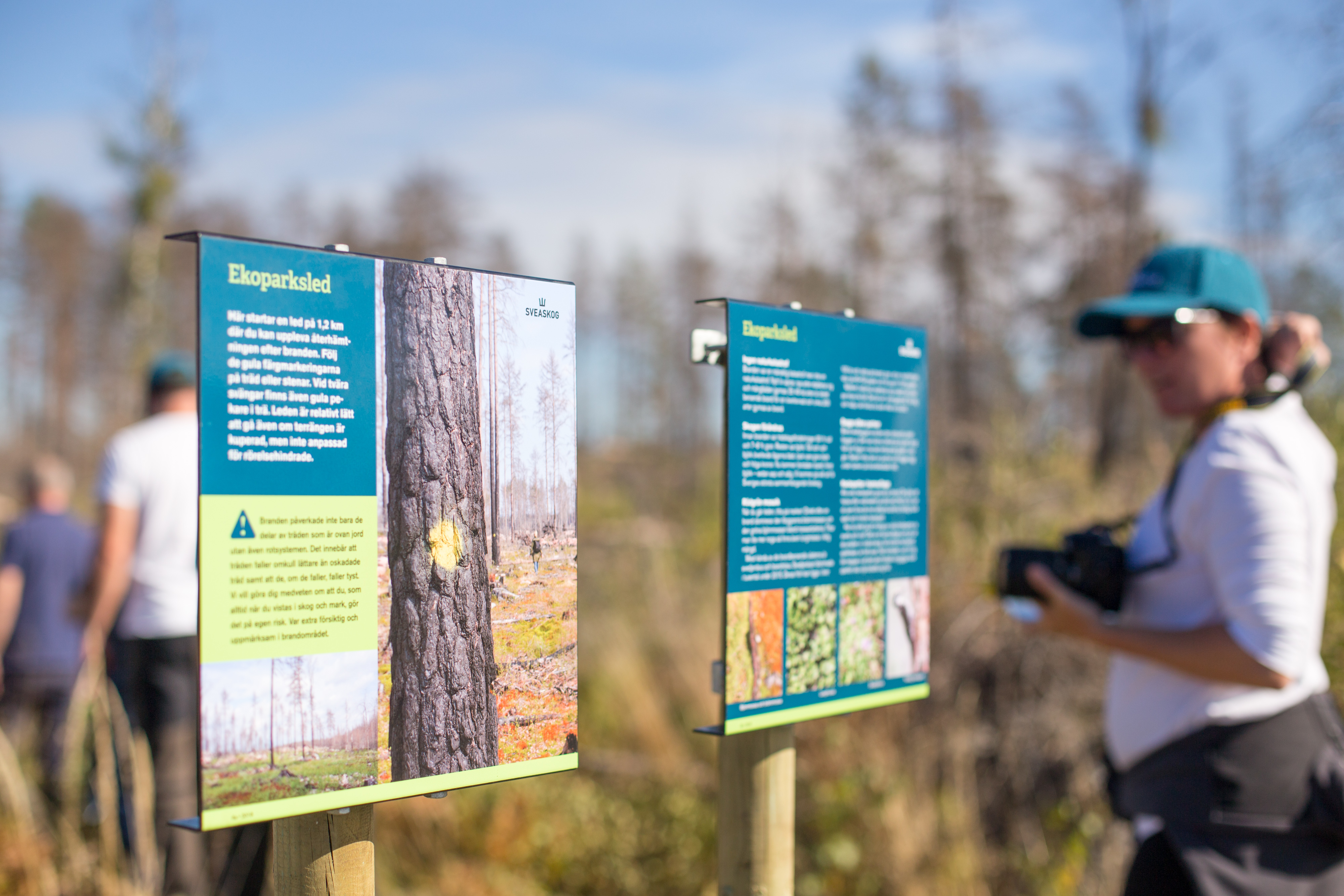 • Beskrivning: Skyltar om ekoparksleden, Skoglig utbildning för ej skogligt utbildade, annan bakgrund, ökat engagemang, från planta till planka, kompetensförsörjning, utbildning, kurs, i ekopark Öjesjöbrännan