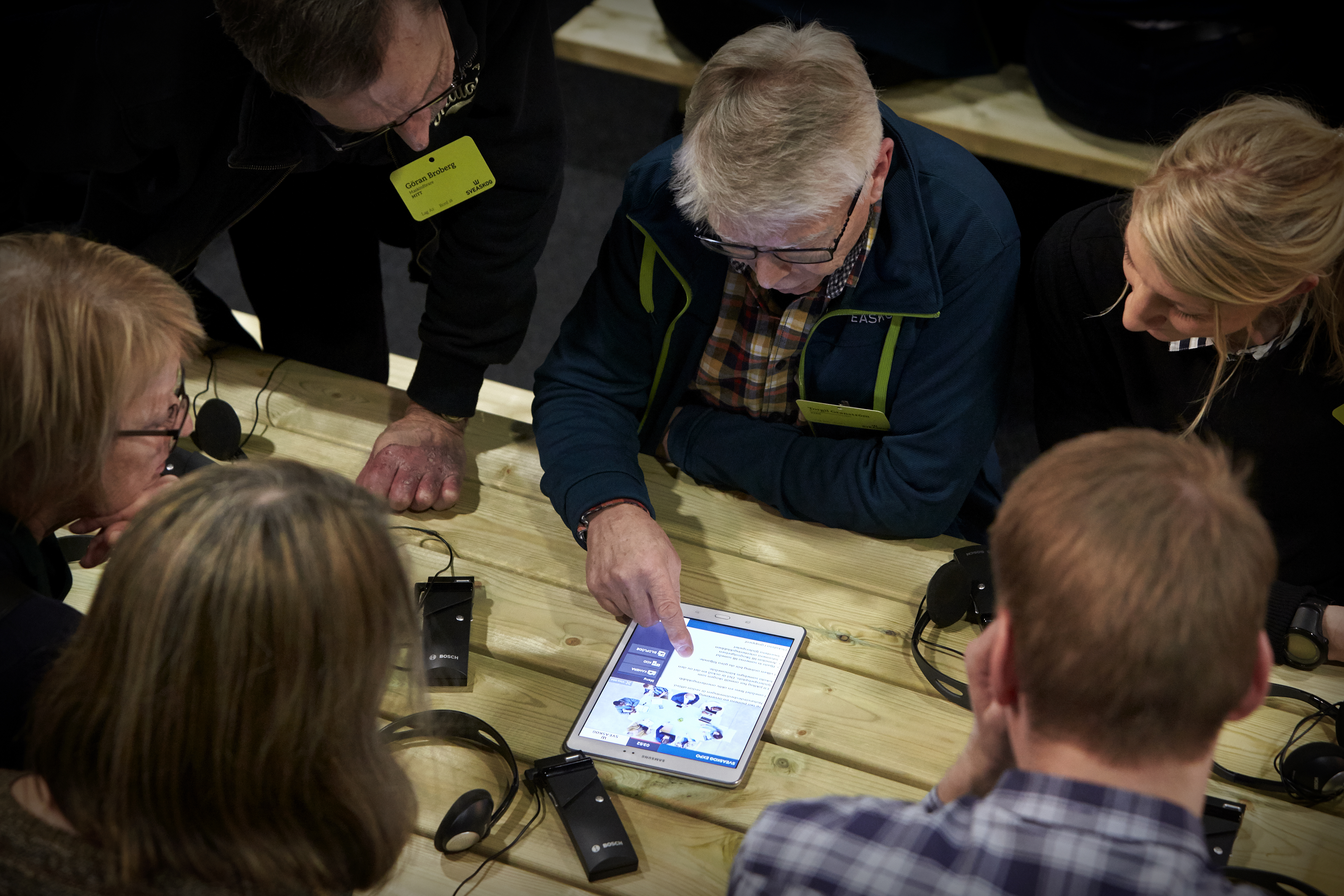• Beskrivning: Team building, möte, konversation, gemenskap, problemlösning, samlade kring surfplatta, tablet, platta, hörluar, grupp, grupparbete, Sveaskogsdagarna 2017, dialog, möte, hela företaget samlat, expo