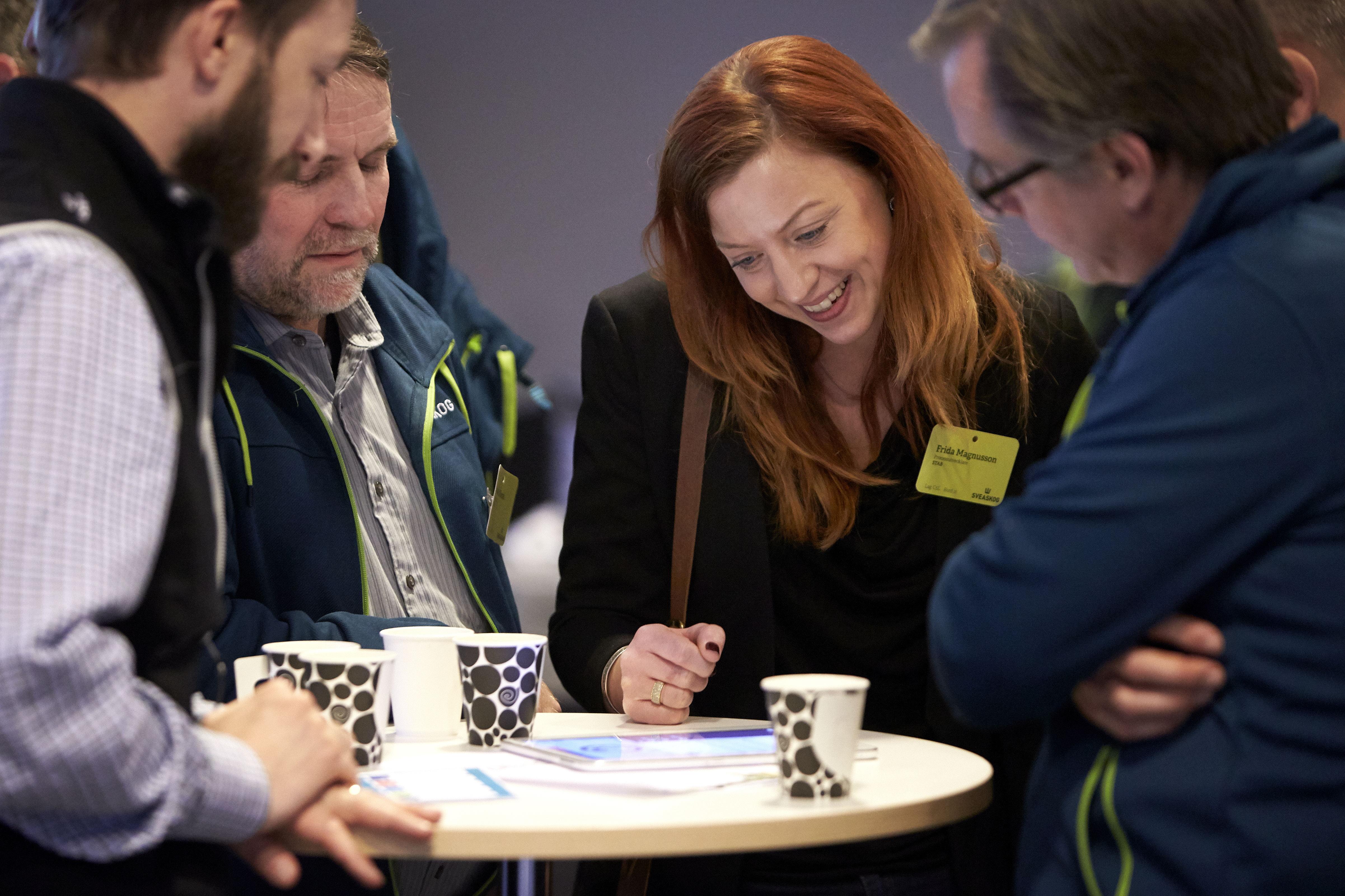 - Beskrivning: Frida Magnusson med flera, gruppövning, grupparbete, team building, samlade runt platta, surfplatta, tablet, Sveaskogsdagarna 2017, dialog, möte, hela företaget samlat, expo