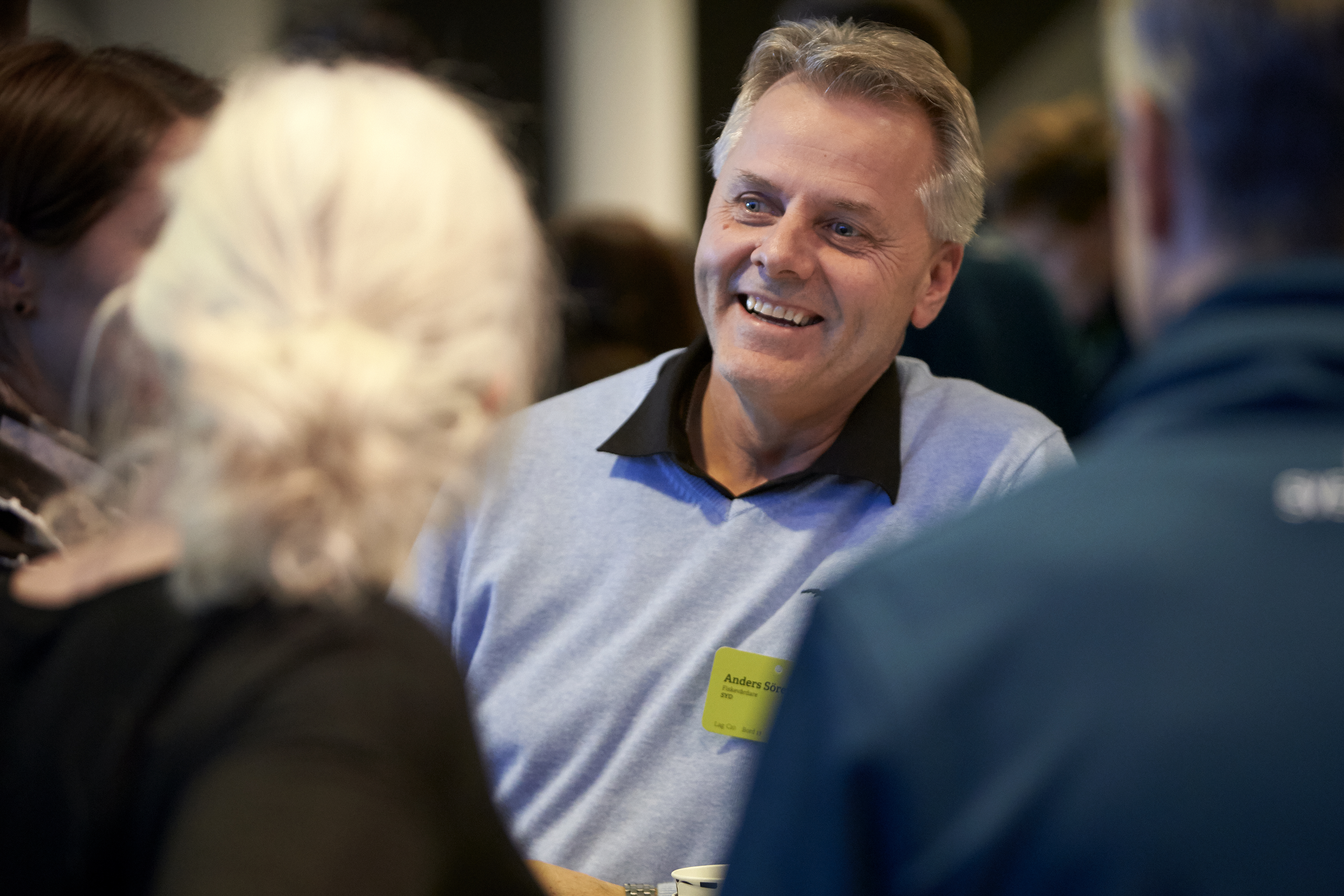 - Beskrivning: Anders Sörensson i en konversation, skrattande, glad, dialog, möte, gemenskap, vänskap, lycka, glad, grupparbete, team building, Sveaskogsdagarna 2017, dialog, möte, hela företaget samlat, expo