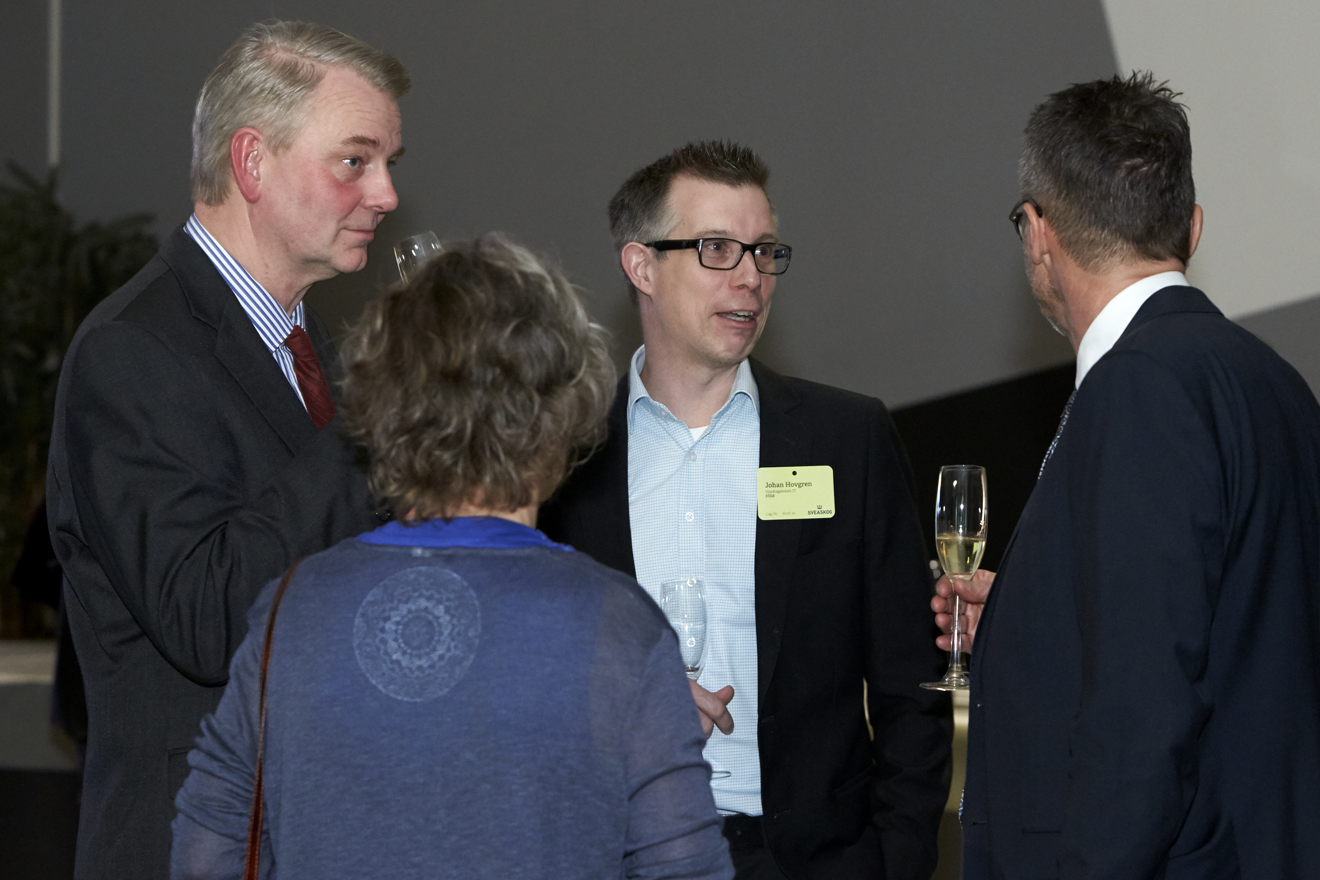 - Beskrivning: Johan Hovgren med flera, mingel, diskussion, finkläder, dialog, samtal, Sveaskogsdagarna 2017, dialog, möte, hela företaget samlat, expo