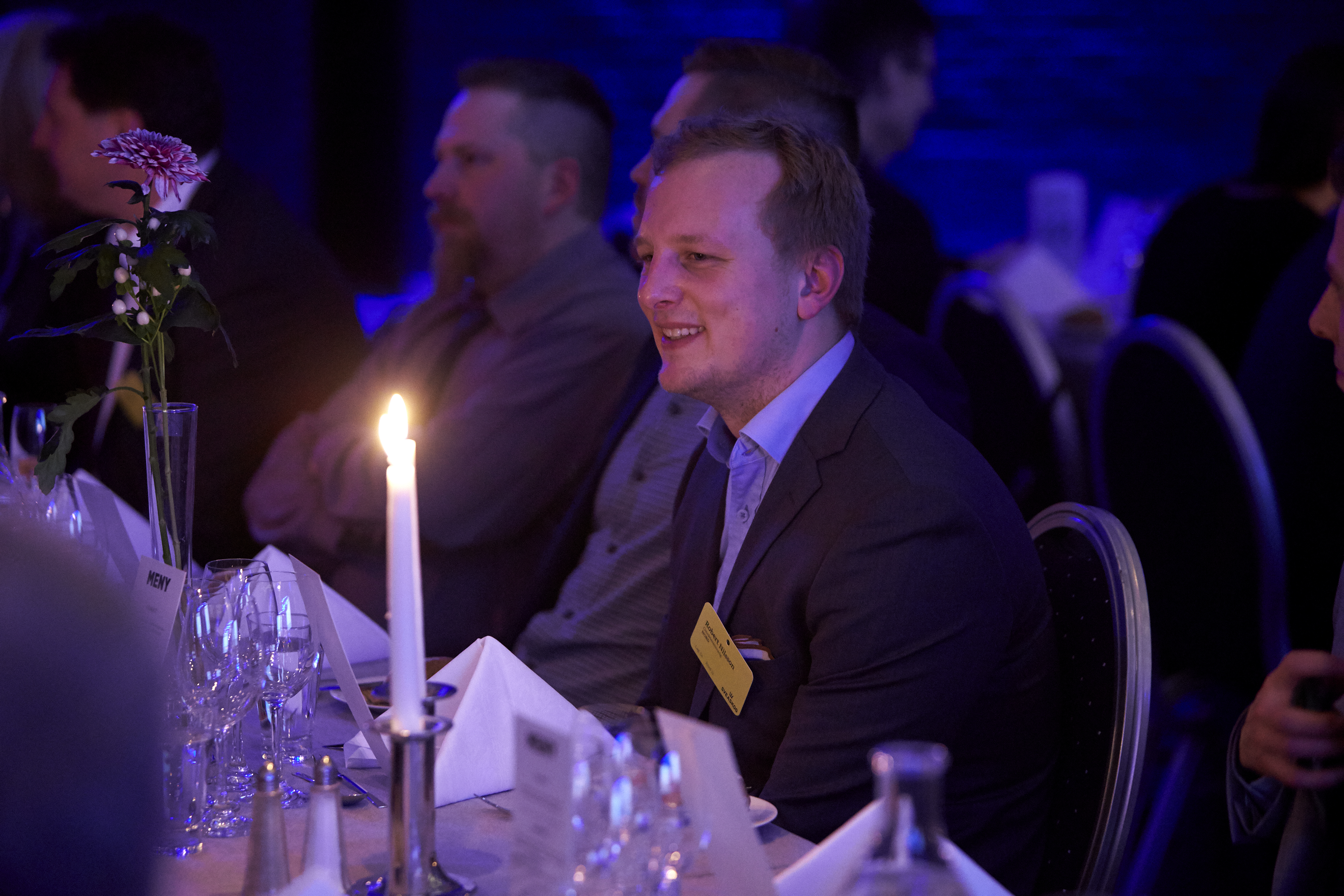 - Beskrivning: Robert Nilsson, ljus, Årets förbättring, middag, fest, Sveaskogsdagarna 2017, dialog, möte, hela företaget samlat, expo