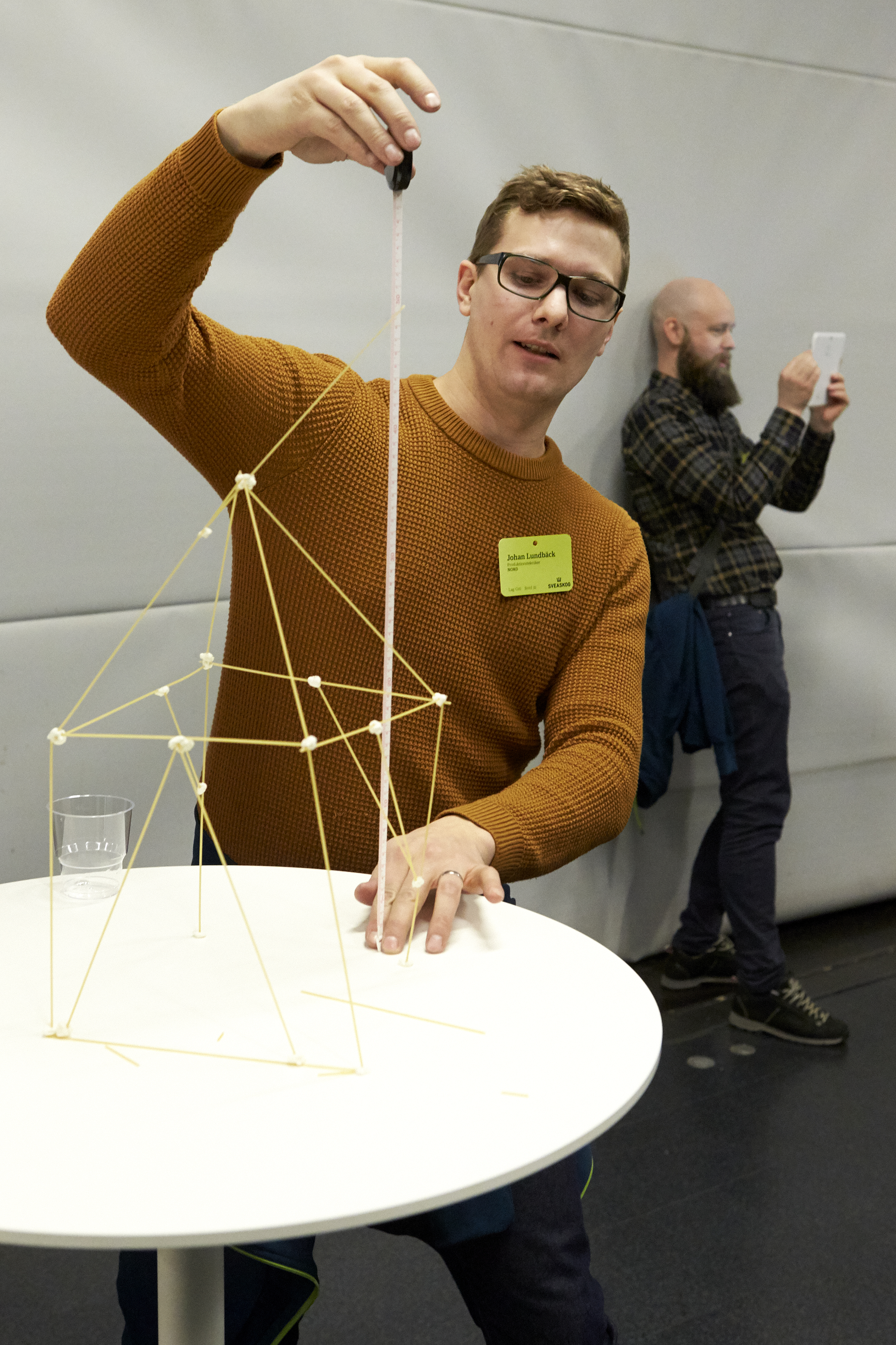 - Beskrivning: Johan Lundbäck mäter hur högt spagettihuset blev, måttband, Station, uppgift, bygga med spaghetti, hållbarhet, gruppövning, team building, Sveaskogsdagarna 2017, dialog, möte, hela företaget samlat, expo, tävling