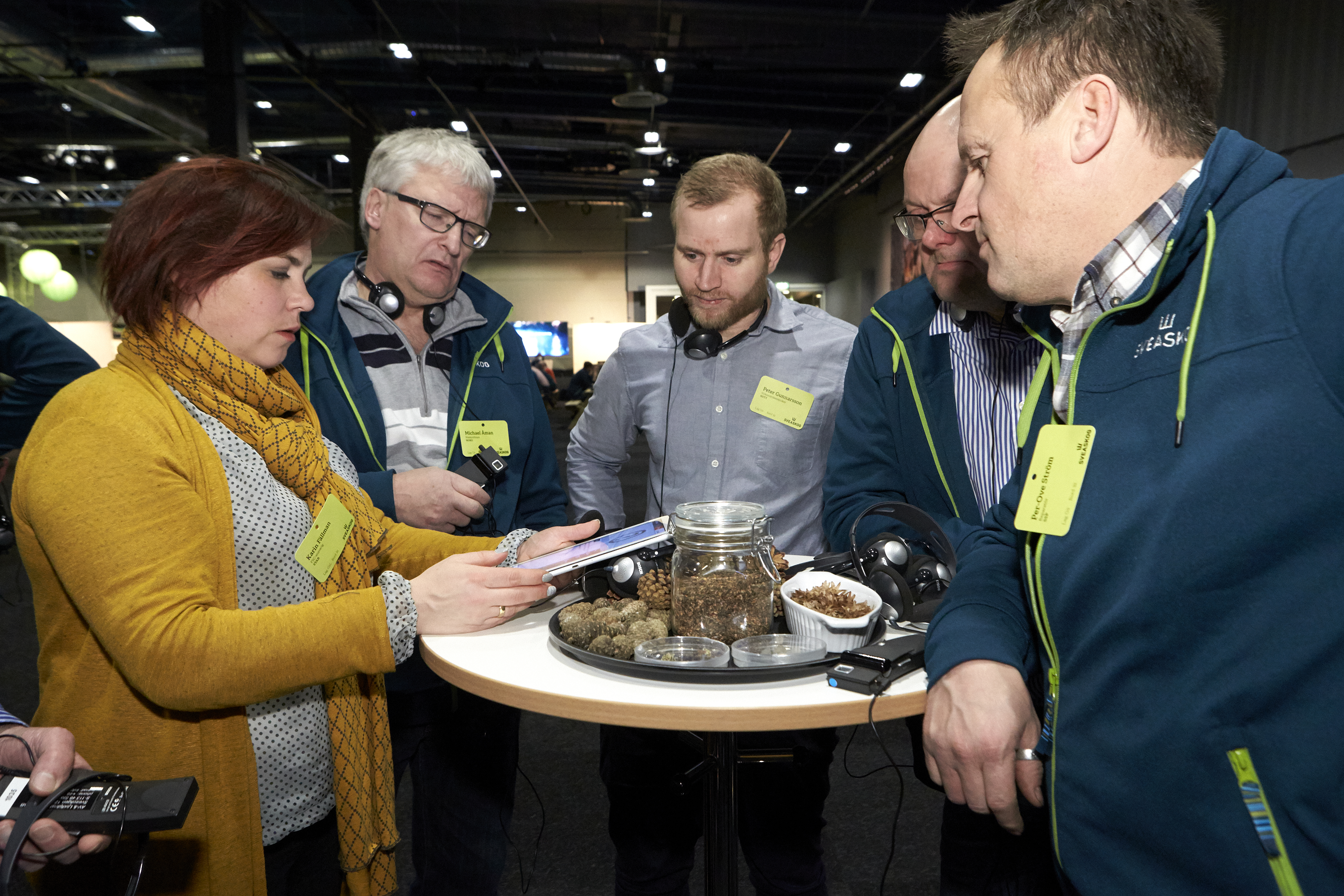 - Beskrivning: Karin Fällman, Michael Åhman, Peter Gunnarsson och Per-Ove Ström, med flera, gruppövning, grupparbete, team building, samlade runt platta, surfplatta, tablet, Sveaskogsdagarna 2017, dialog, möte, hela företaget samlat, expo