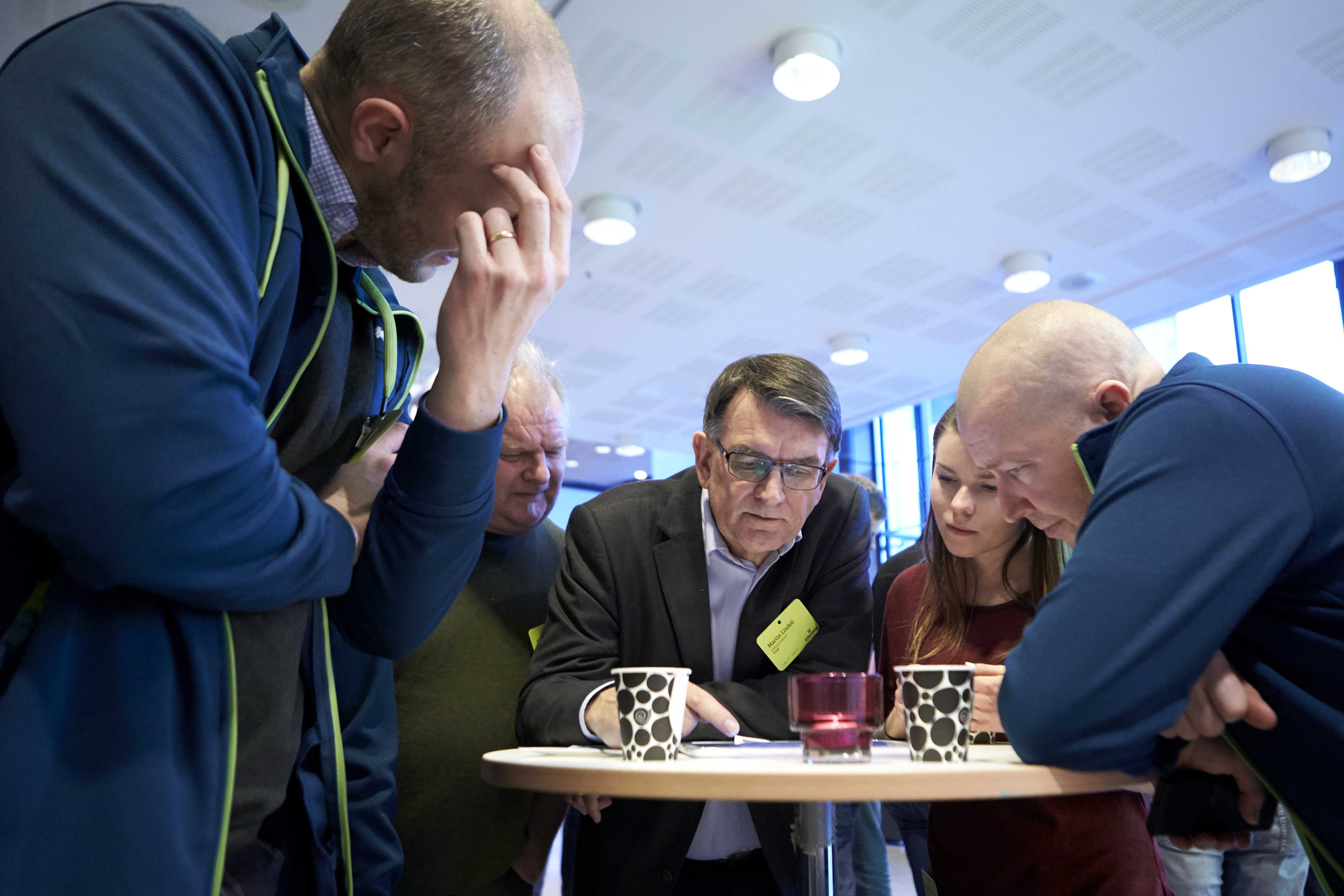 - Beskrivning: Martin Lindell med flera, gruppövning, grupparbete, team building, samlade runt platta, surfplatta, tablet, Sveaskogsdagarna 2017, dialog, möte, hela företaget samlat, expo