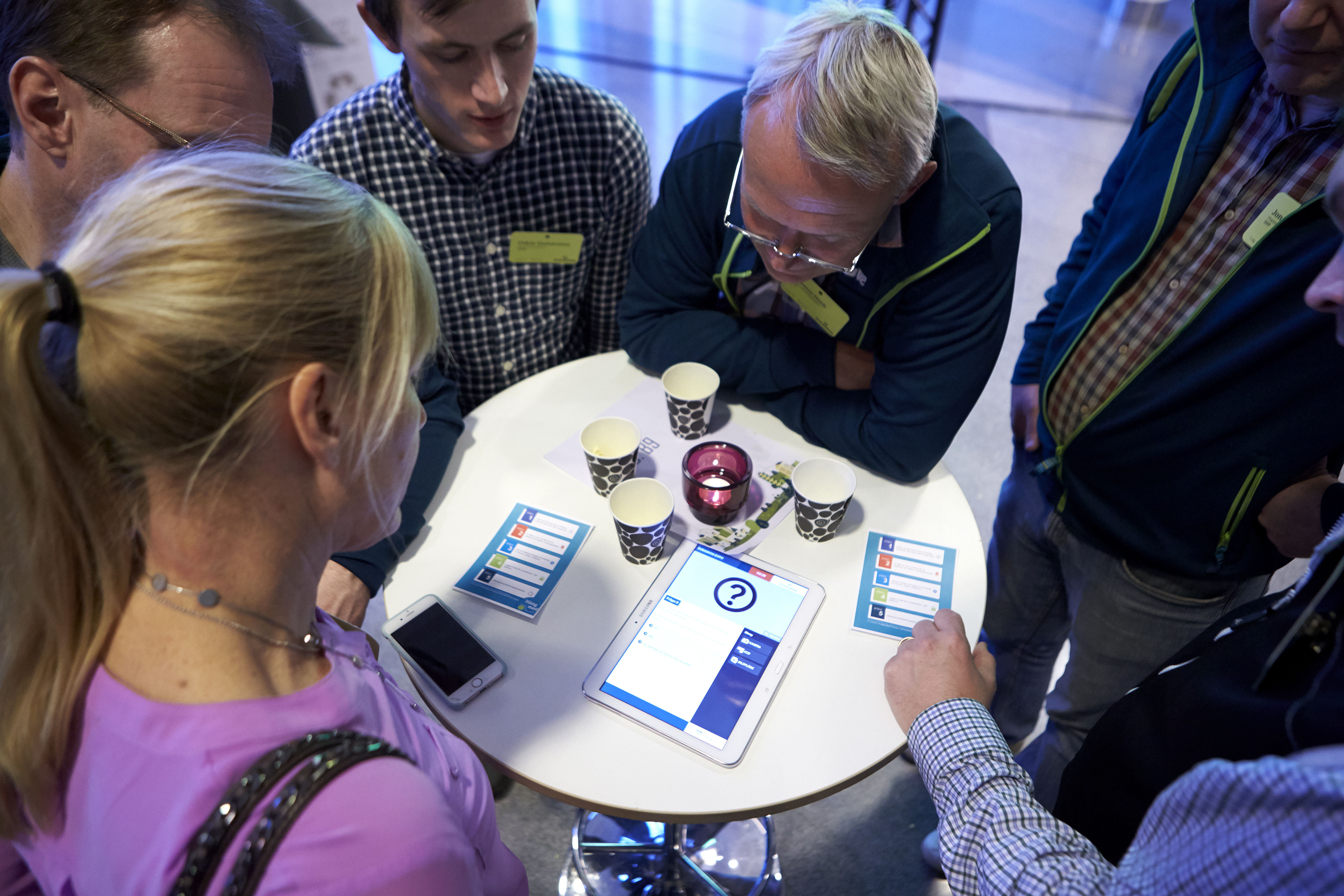 - Beskrivning: gruppövning, grupparbete, team building, samlade runt platta, surfplatta, tablet, Sveaskogsdagarna 2017, dialog, möte, hela företaget samlat, expo, frågor