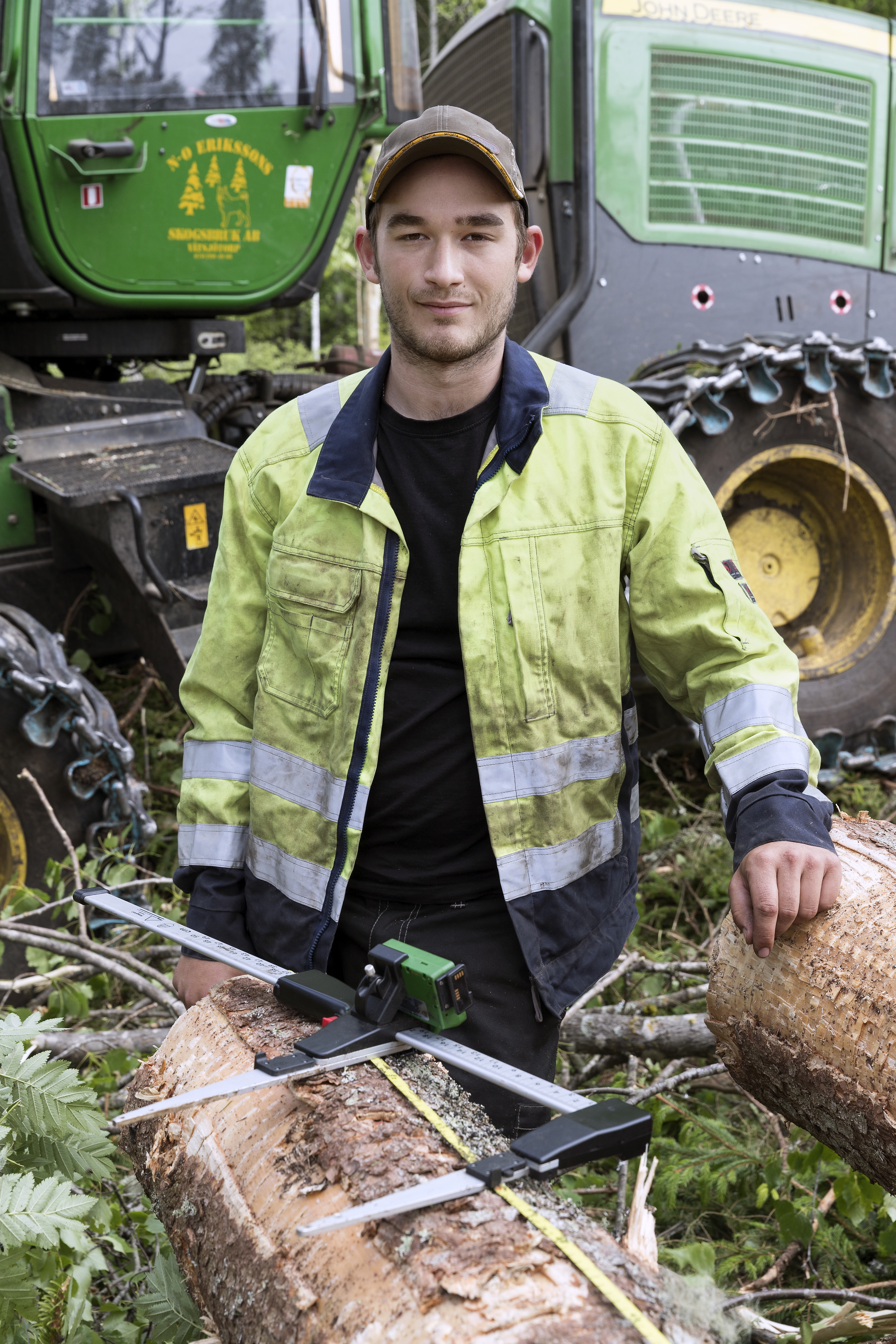 - Beskrivning: Rickard Johansson anställd maskinförare på NOE Skogsbruk AB (entreprenör), lag 6659. Skogen ska hanteras med respekt, I arbetet med att förvalta varje enskilt träd så att bästa möjliga värde skapas ur skogen spelar maskinlaget en nyckelroll. Genom kontinuerlig uppföljning blir misstagen färre och kunderna nöjda, Manuell mätning av stammarna, dataklave, virkeskvalitet, klavverktyg