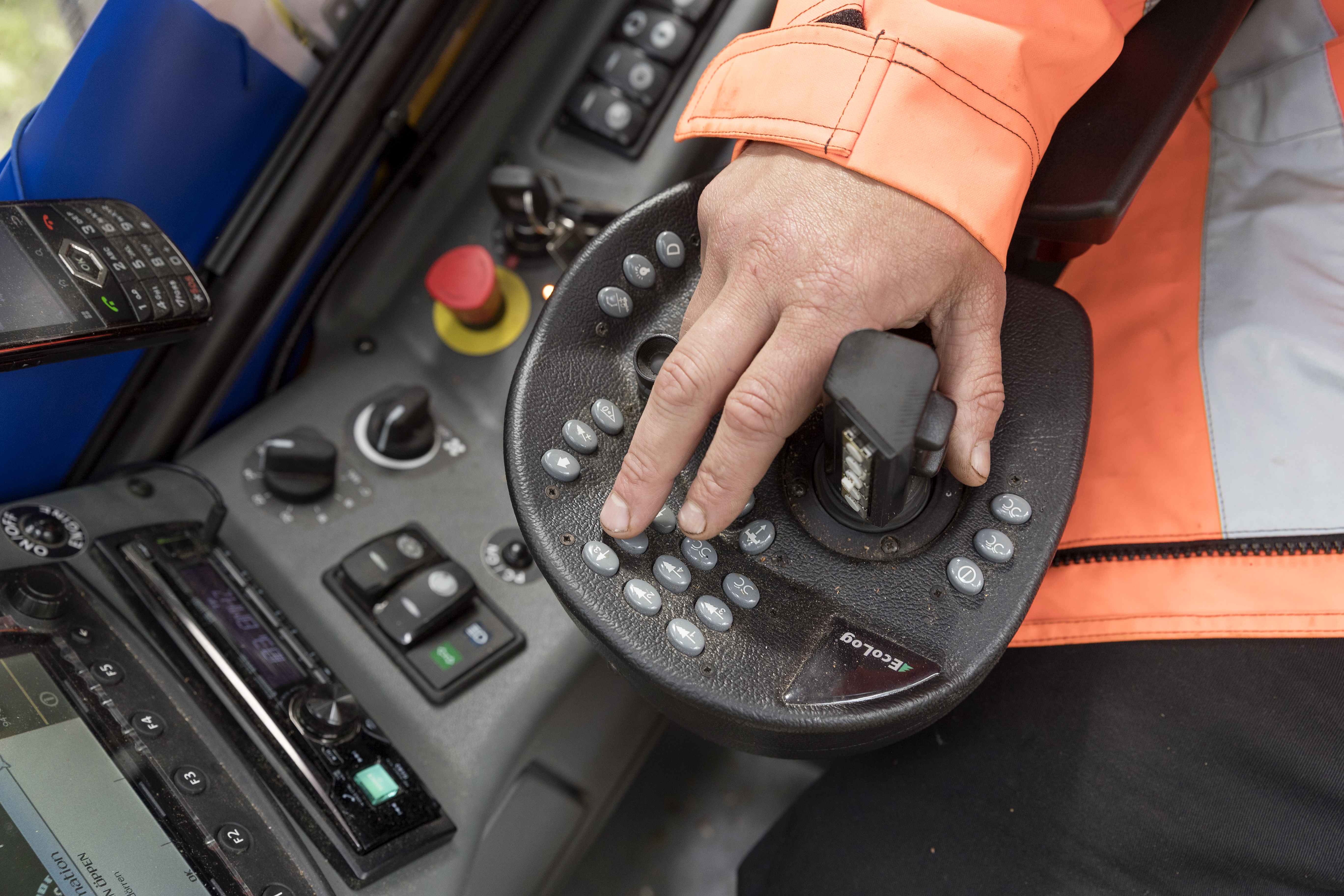 - Beskrivning: Knapptryckning, knappar, spakar, insida av skogsmaskin, reglage, ratt, Skogen ska hanteras med respekt, I arbetet med att förvalta varje enskilt träd så att bästa möjliga värde skapas ur skogen spelar maskinlaget en nyckelroll. Genom kontinuerlig uppföljning blir misstagen färre och kunderna nöjda, Manuell mätning av stammarna, dataklave, virkeskvalitet