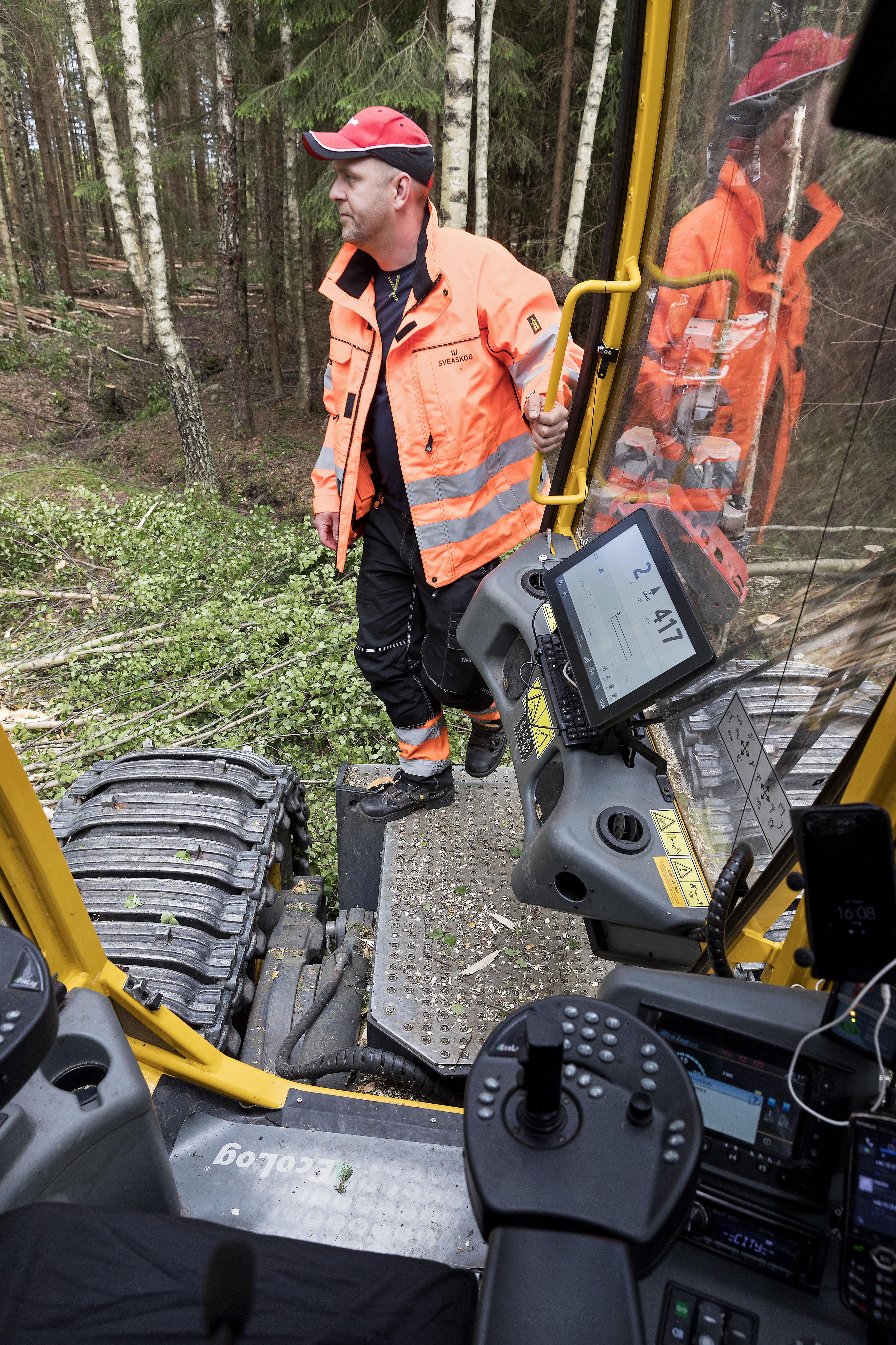 - Beskrivning: Johan Henriksson anställd maskinförare på Tifa Skog AB (entreprenör), lag 6678, Skogen ska hanteras med respekt, I arbetet med att förvalta varje enskilt träd så att bästa möjliga värde skapas ur skogen spelar maskinlaget en nyckelroll. Genom kontinuerlig uppföljning blir misstagen färre och kunderna nöjda, Manuell mätning av stammarna, dataklave, virkeskvalitet