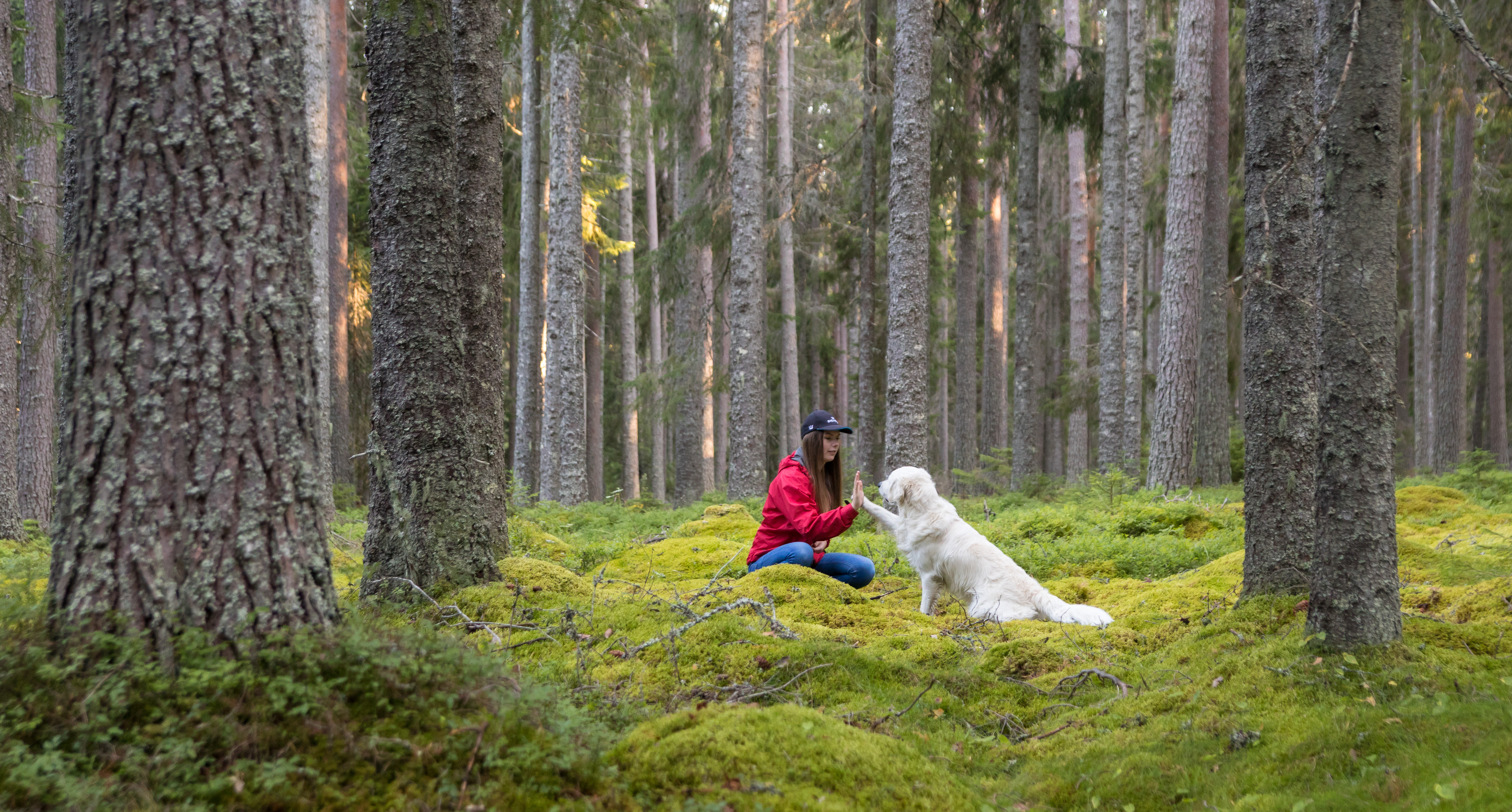 Flicka och hund i skogen
