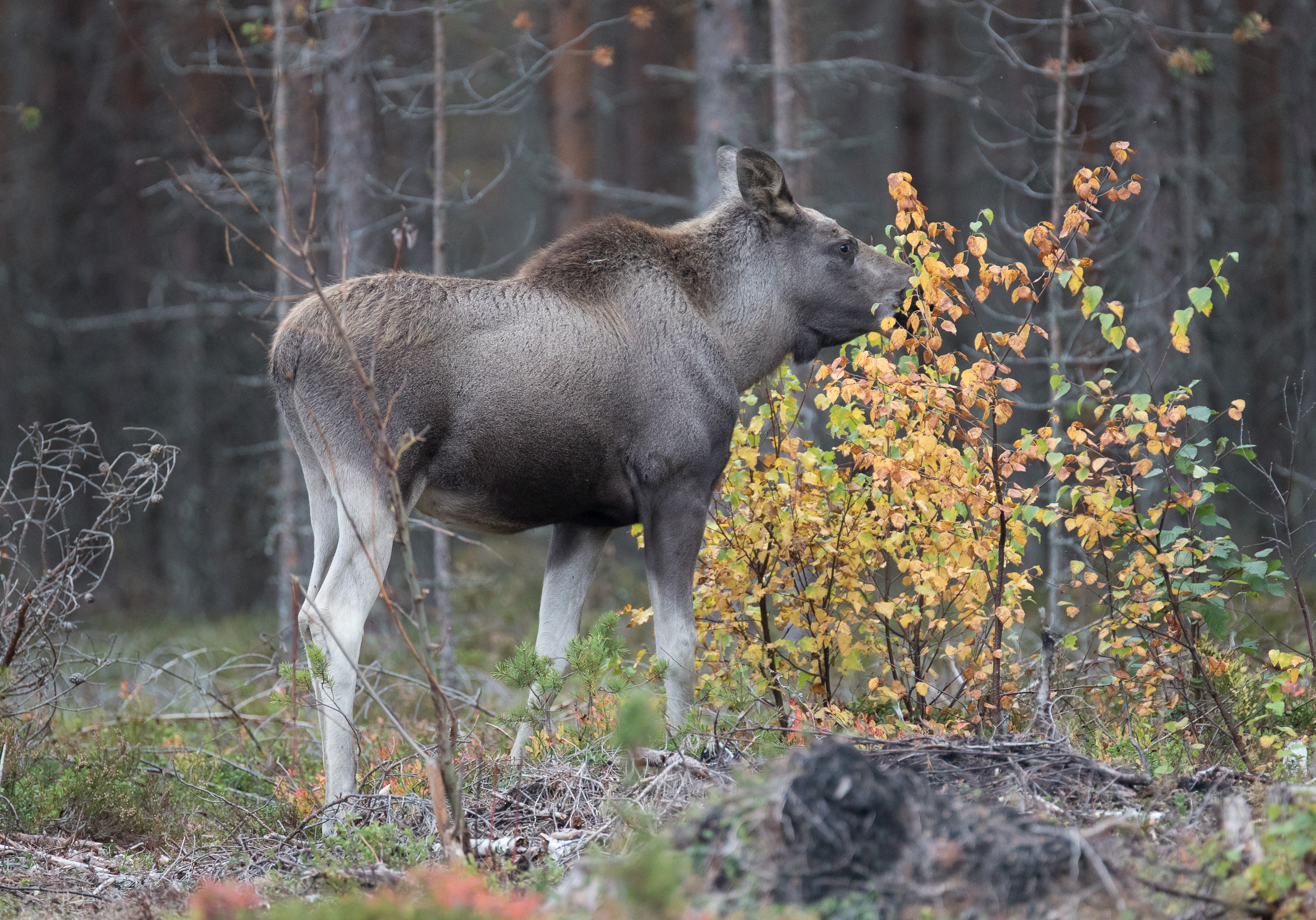 - Beskrivning: Älg som betar, beta, äta, lövträd, betesskador