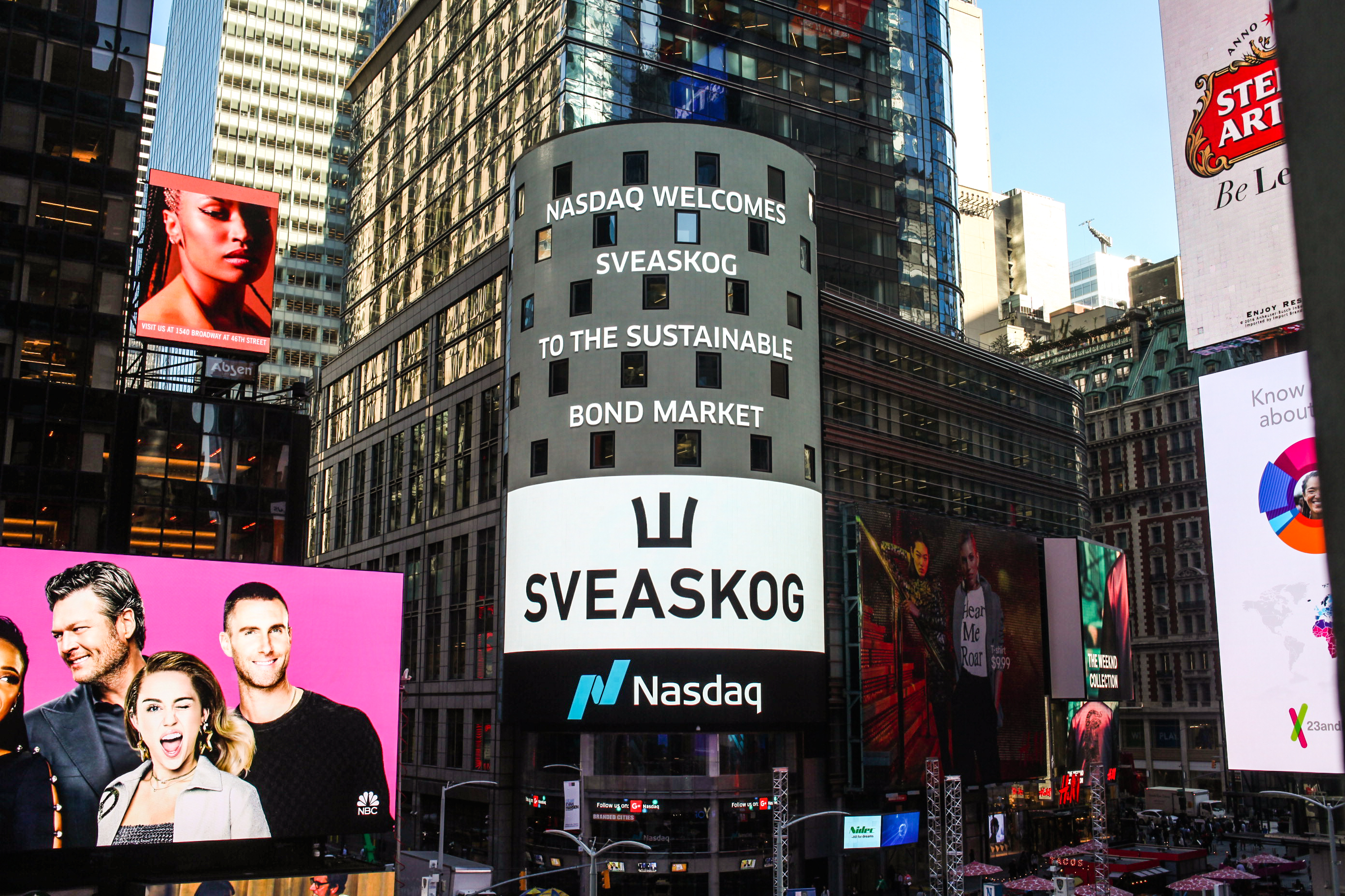 - Beskrivning: inringningen av Sveaskogs andra gröna obligation på Nasdaq den 27 oktober 2017, grön obligation, reklamskyltar, gata, Nasdaq den 27 oktober 2017
