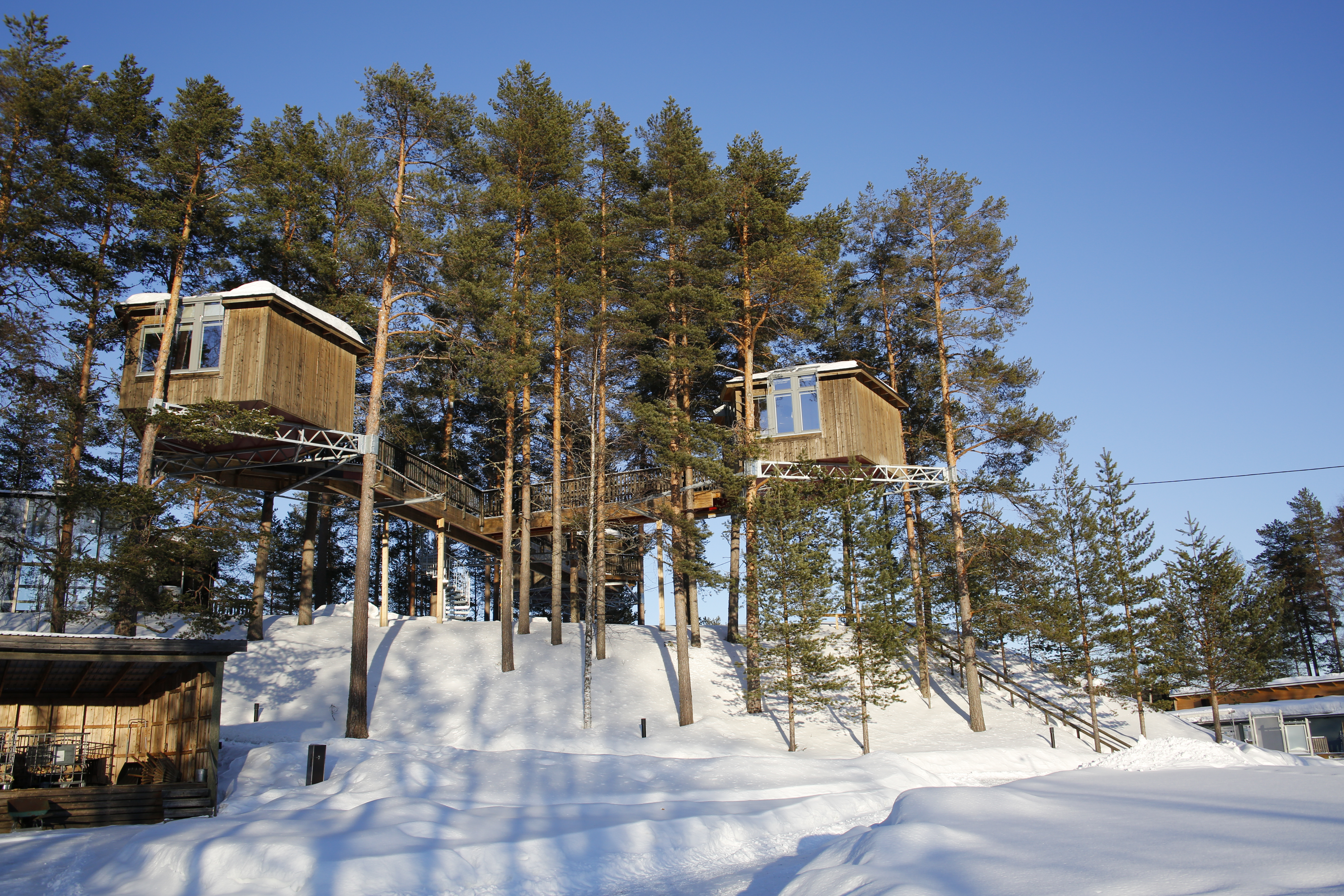- Beskrivning: Fågelnästen på Granö Beckasin. Till höger syns reception och restaurang, Granö Beckasin, exotisk natur i svensk skogsbygd, naturupplevelser i världsklass, på Sveaskogs marker, trädhotell, hotell i träd, hotell