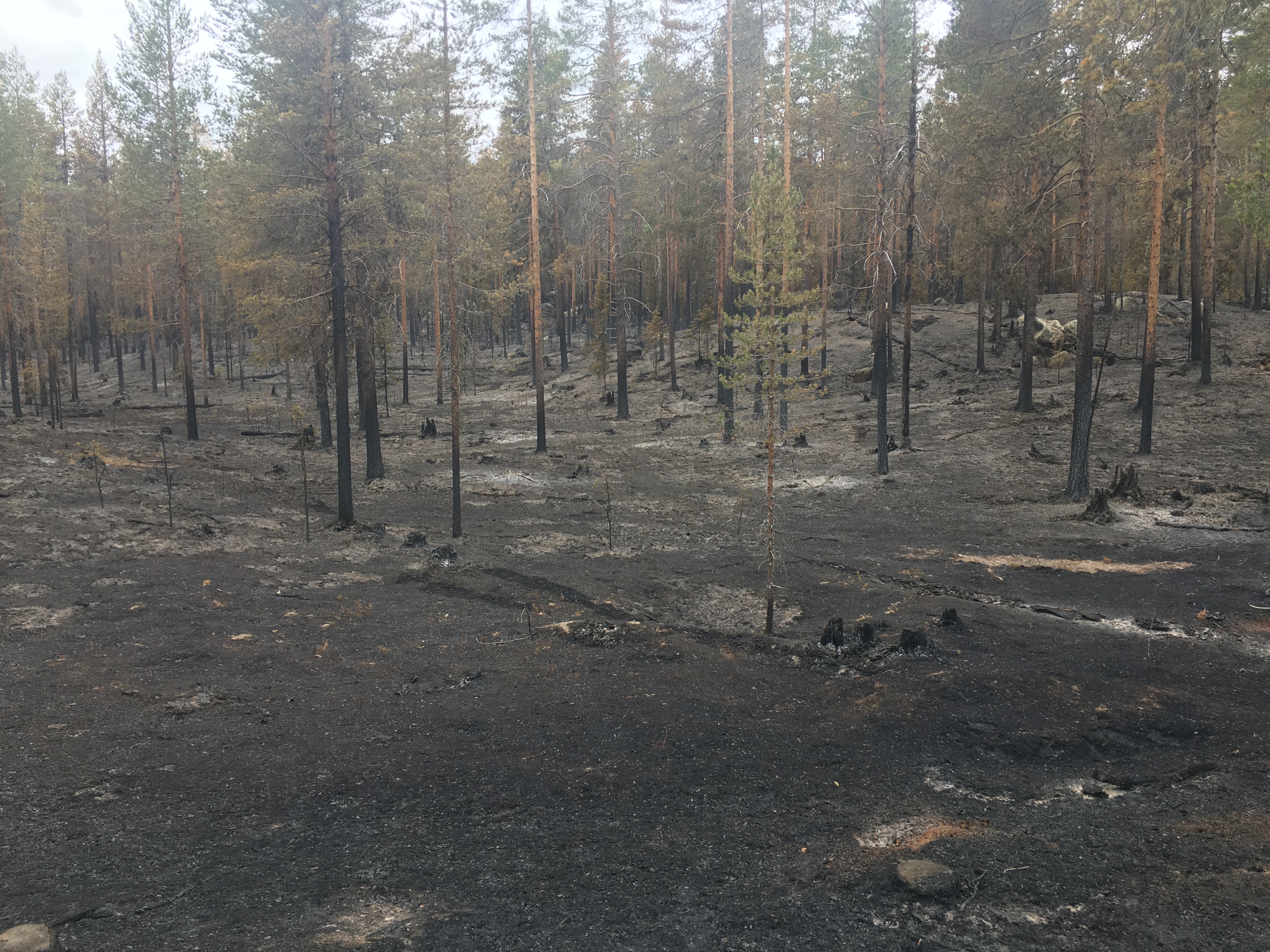 • Beskrivning: Efter skogsbränderna 2018, skogsbrand, efter brand, eftersläckning, aska, nedbränd skog