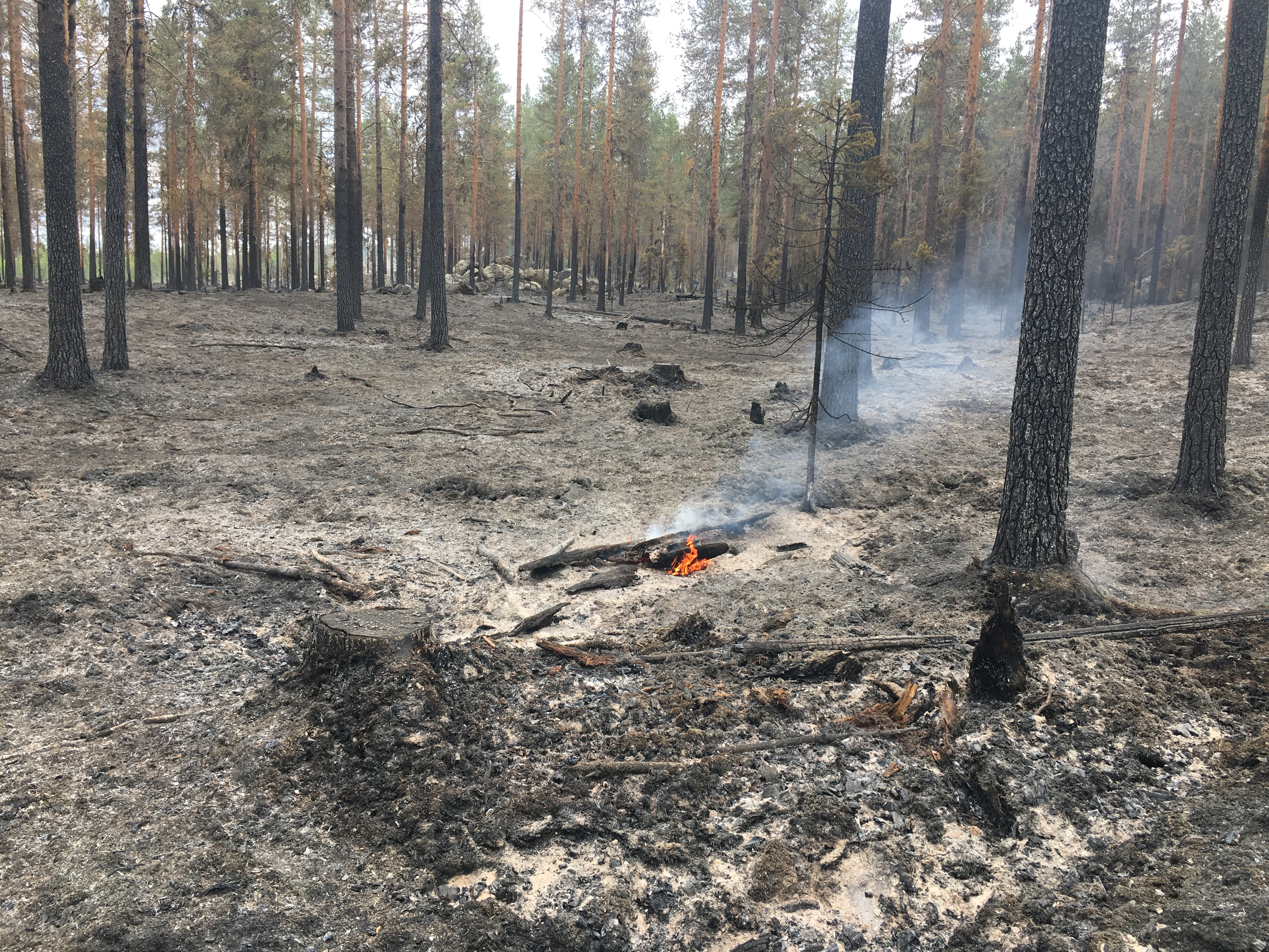 • Beskrivning: Efter skogsbränderna 2018, skogsbrand, efter brand, eftersläckning, aska, rök