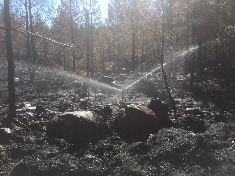 - Beskrivning: Efter skogsbränderna 2018, skogsbrand, efter brand, eftersläckning, Efter Kostabranden, aska, nedbränd skog, vattenstrålar, släckning, sprinkler, Sprinkler bevattnar i kanten av området så att ev. glödhärd inte utvecklas till brand och sprider sig till omkringliggande bestånd.