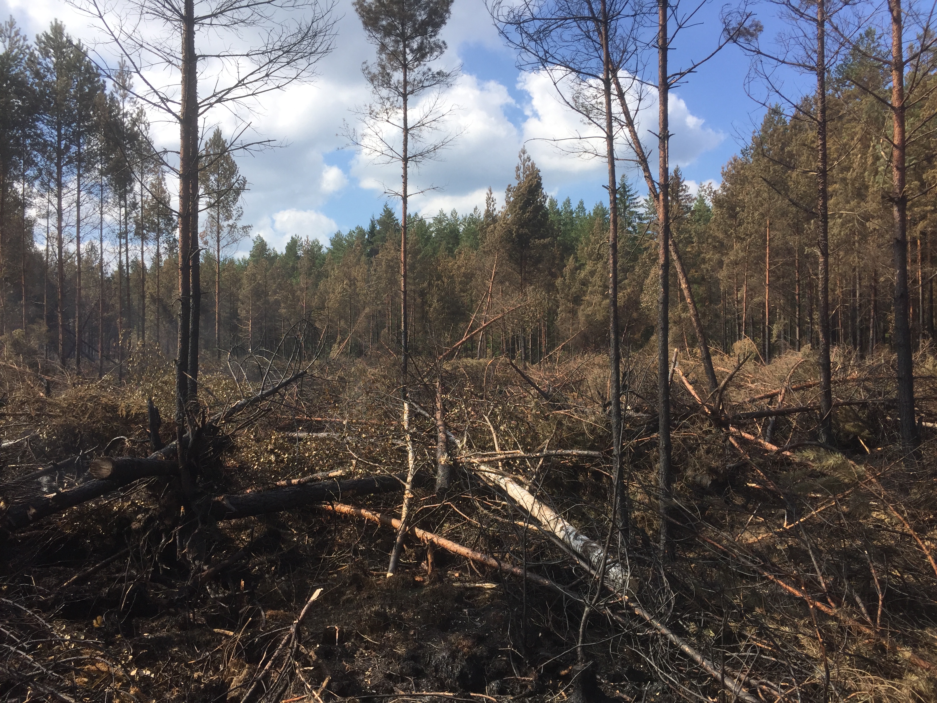 - Beskrivning: Efter skogsbränderna 2018, skogsbrand, efter brand, eftersläckning, Efter Kostabranden, aska, nedbränd skog, Torvmarksdel av beståndet. Avbrända rötter gör att träden har fallit i stor mängd.