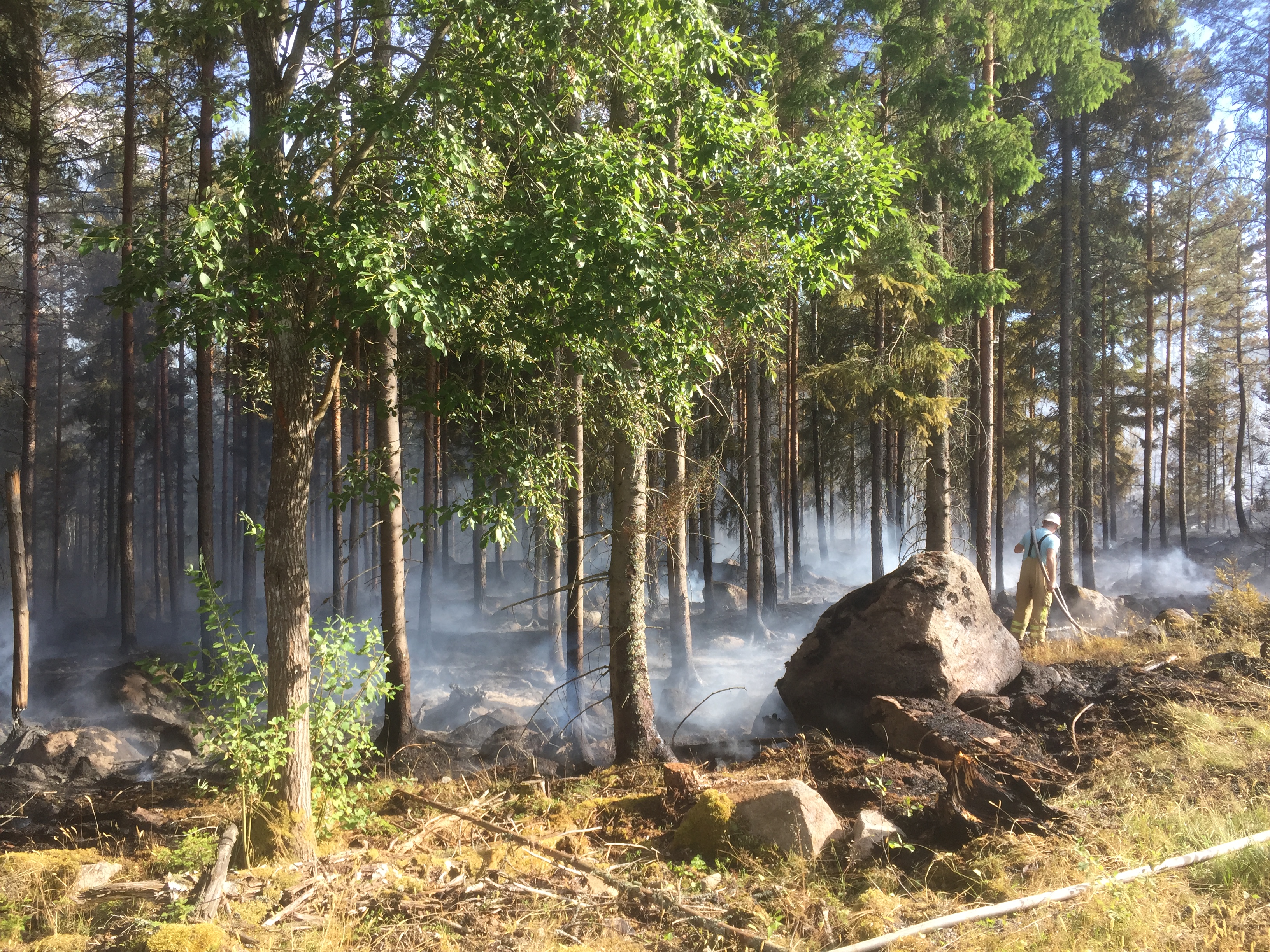 • Beskrivning: Efter skogsbränderna 2018, skogsbrand, efter brand, eftersläckning, Efter Kostabranden, aska, nedbränd skog