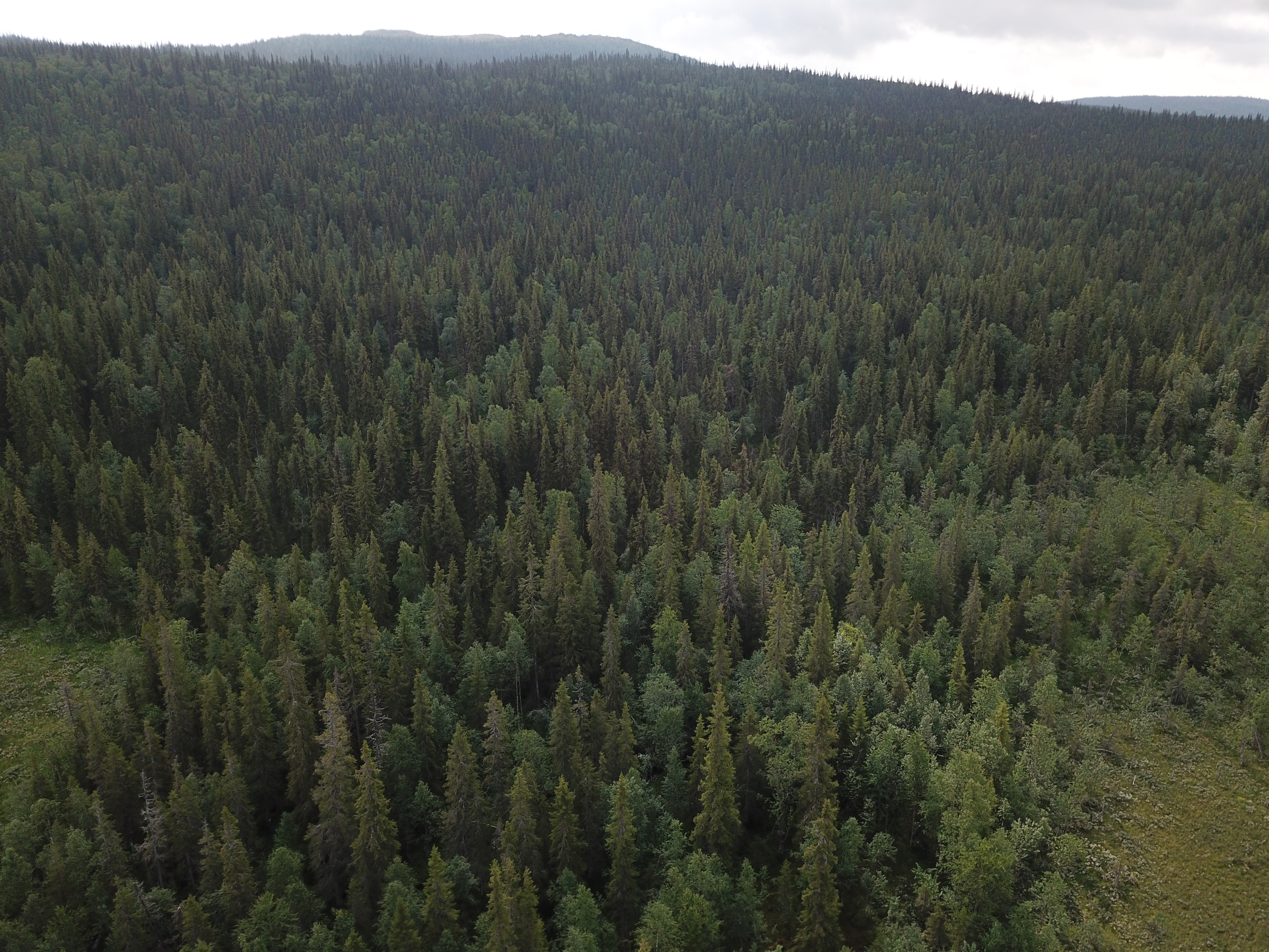 - Beskrivning: Landskapsbild, landskap, drönarbild, drönare, träd, Arjeplog Storberget, Skogsegendom i Arjeplogs kommun, bild från fastighet, granskog, ovanifrån, vackert skogslandskap