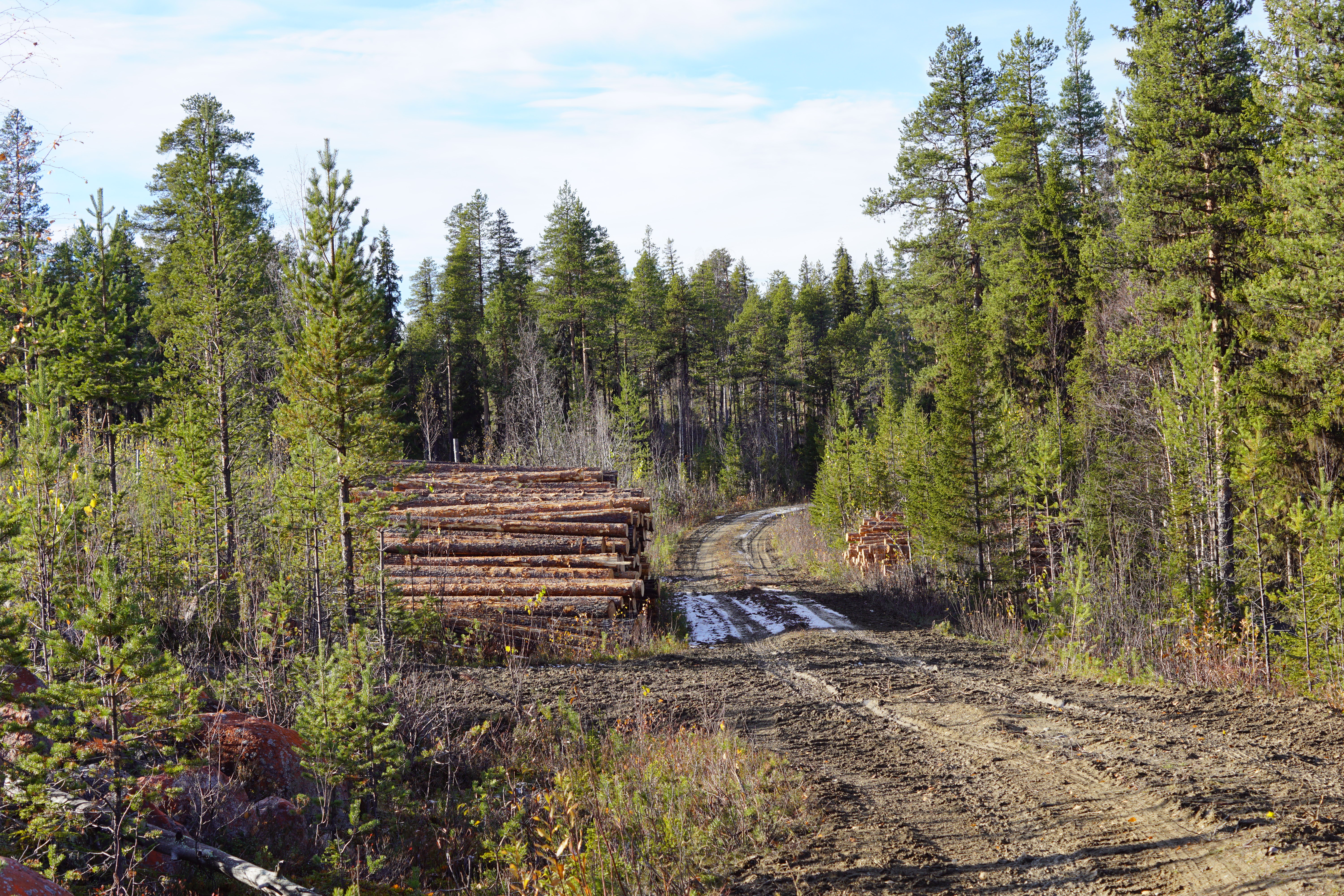 • Beskrivning: Skogsväg, timmervälta, väg i skogen, virke, stockar intill väg