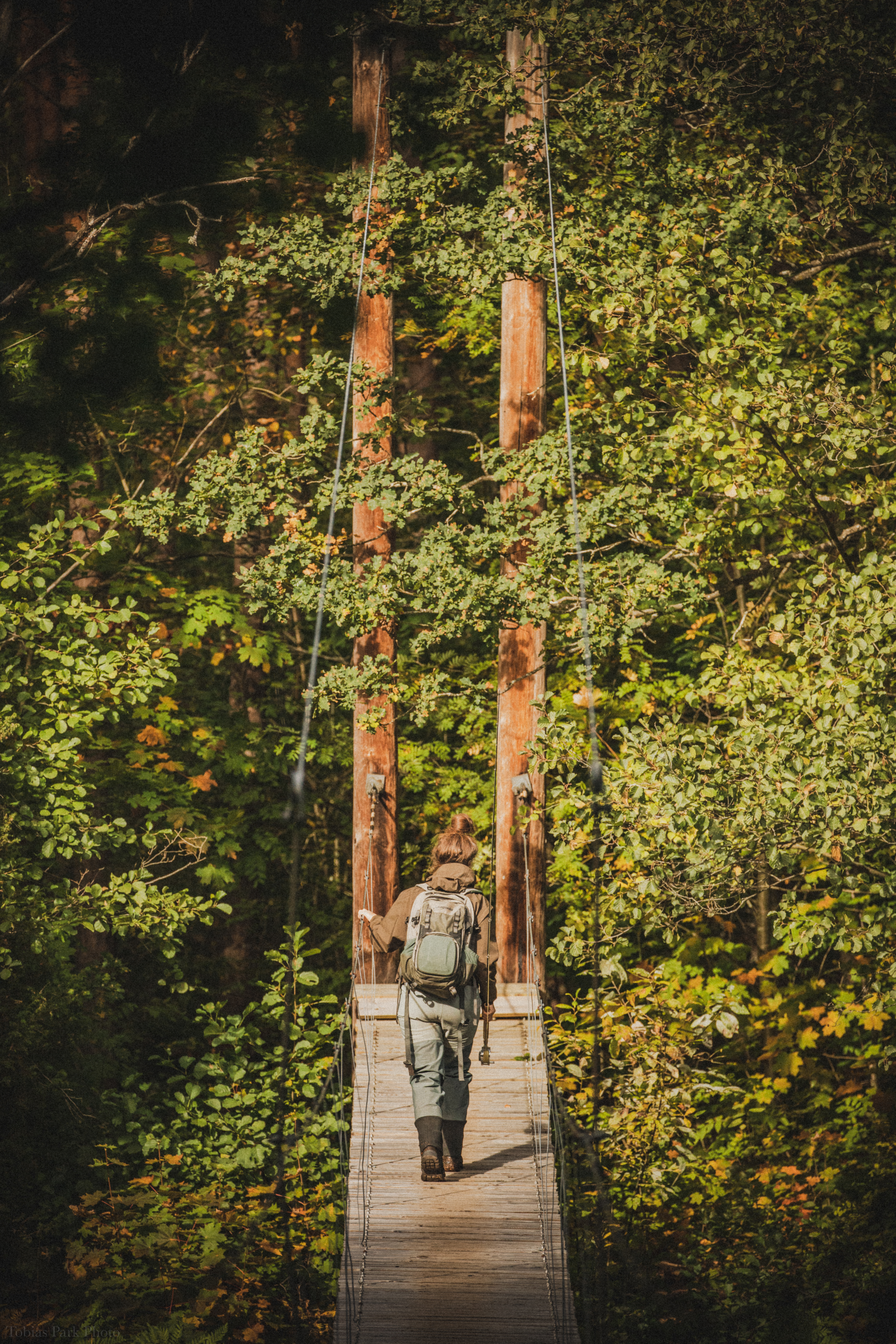 - Beskrivning: Fiskare går över hängbro, Mörrumsån