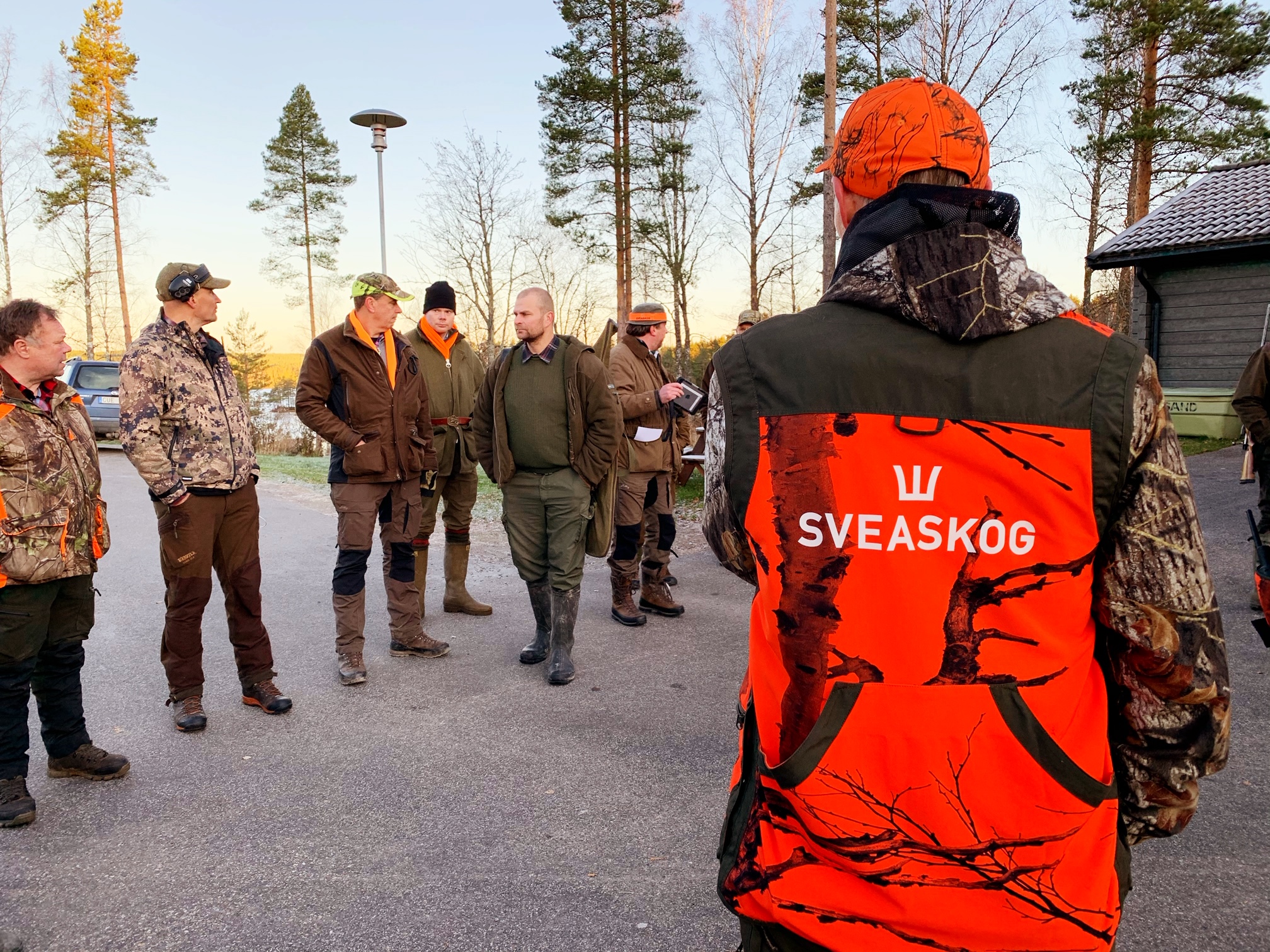 - Beskrivning: Jägare, samling inför jakten, Sveaskogs logotyp, profilkläder