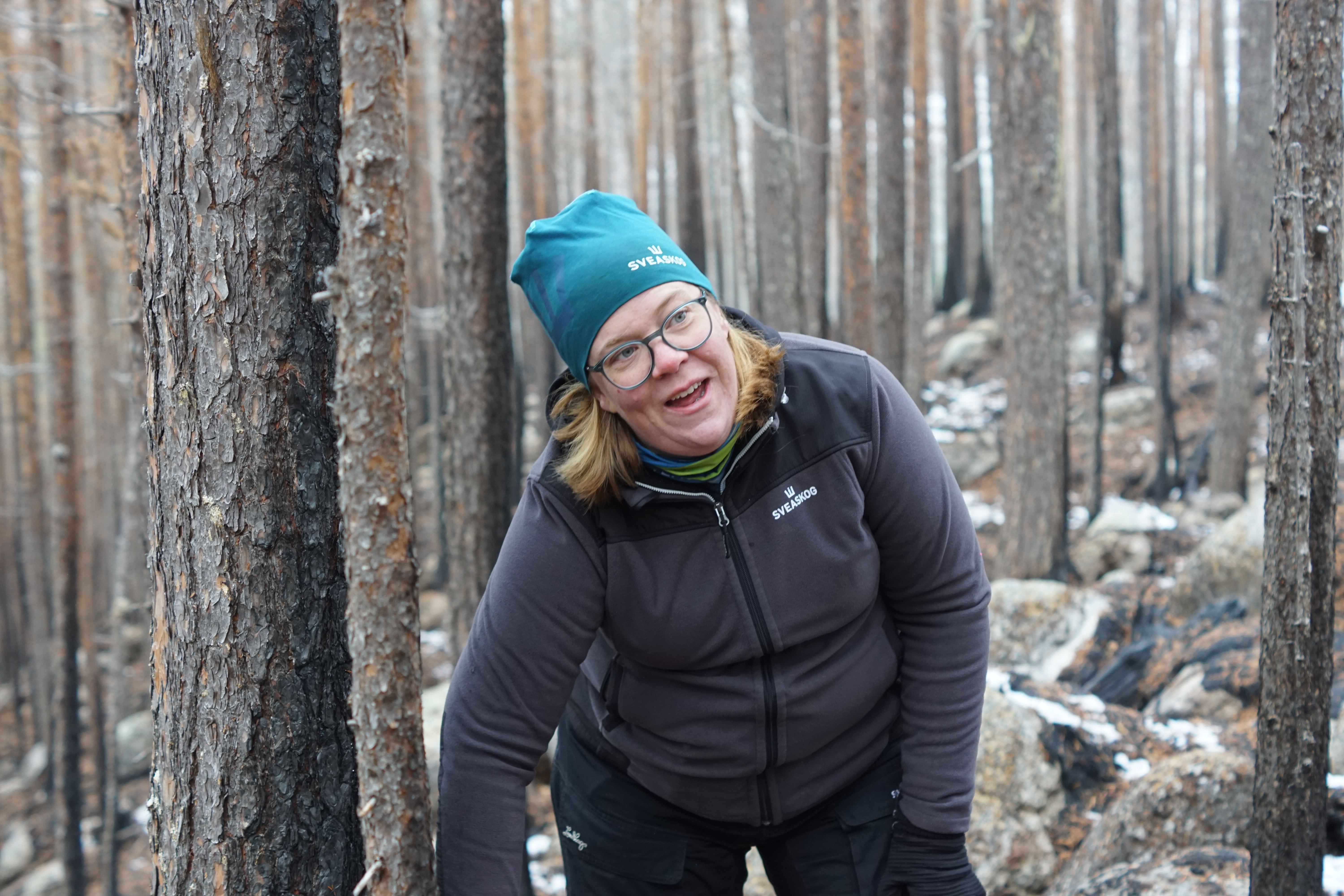 - Beskrivning: Naturvårdsbränning i Ekopark Käringberget, Daniella Andersson, profilkläder, logotyp, blå mössa, kofta, träd, brand