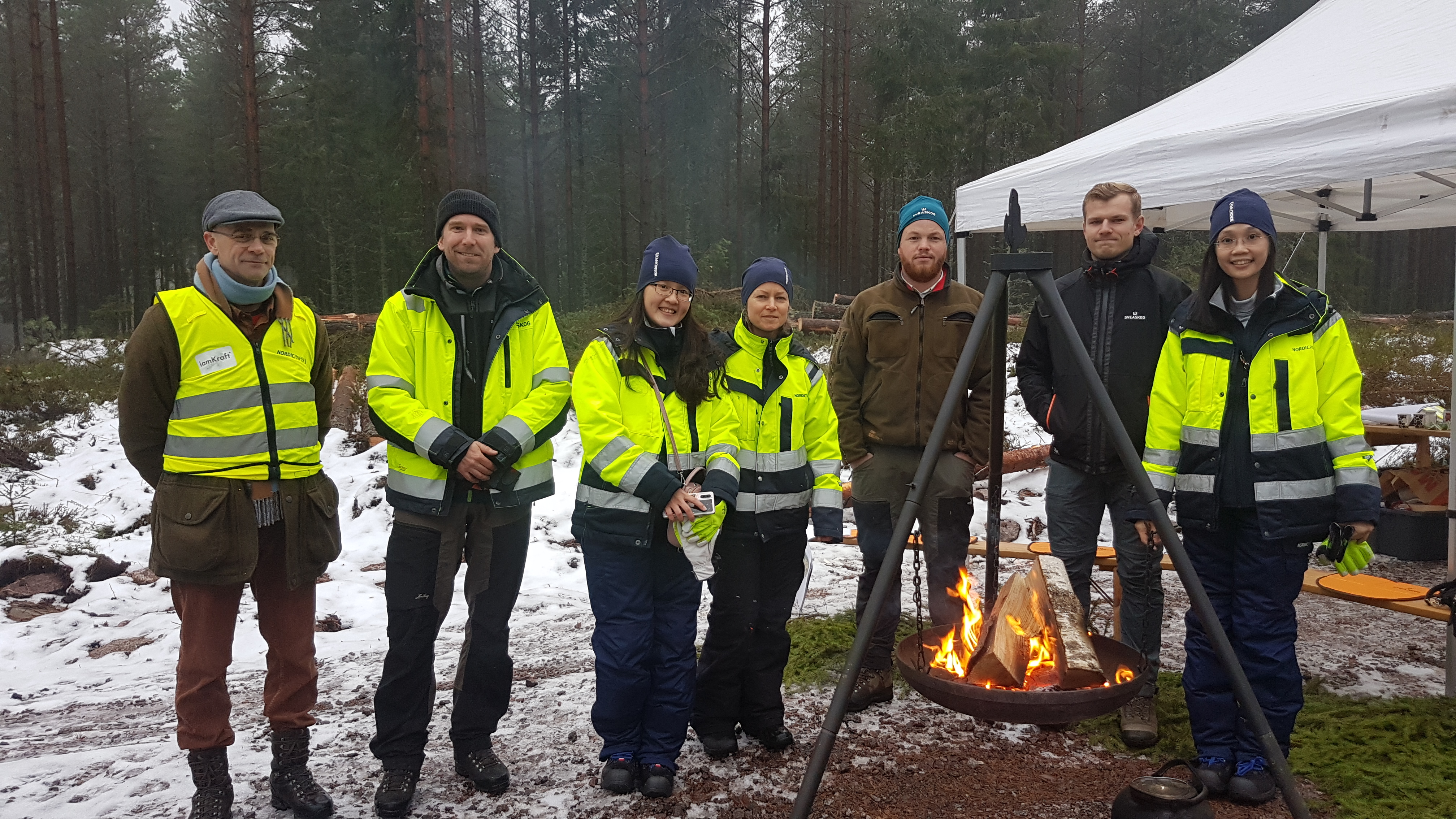 - Beskrivning: Hållbarhet i fokus hos kundens kund, eld, reflexjackor, gruppbild, kundbesök, Lih Meis delegation utgjordes av företagets ägare/vd, planerare, kvalitetsansvarig samt inköpare, från Nordic Paper deltog Pia Lundin, Technical support Manager, Linda Kihlström, Area Sales Director, och Tomas Gustén, Wood purchasing Manager
