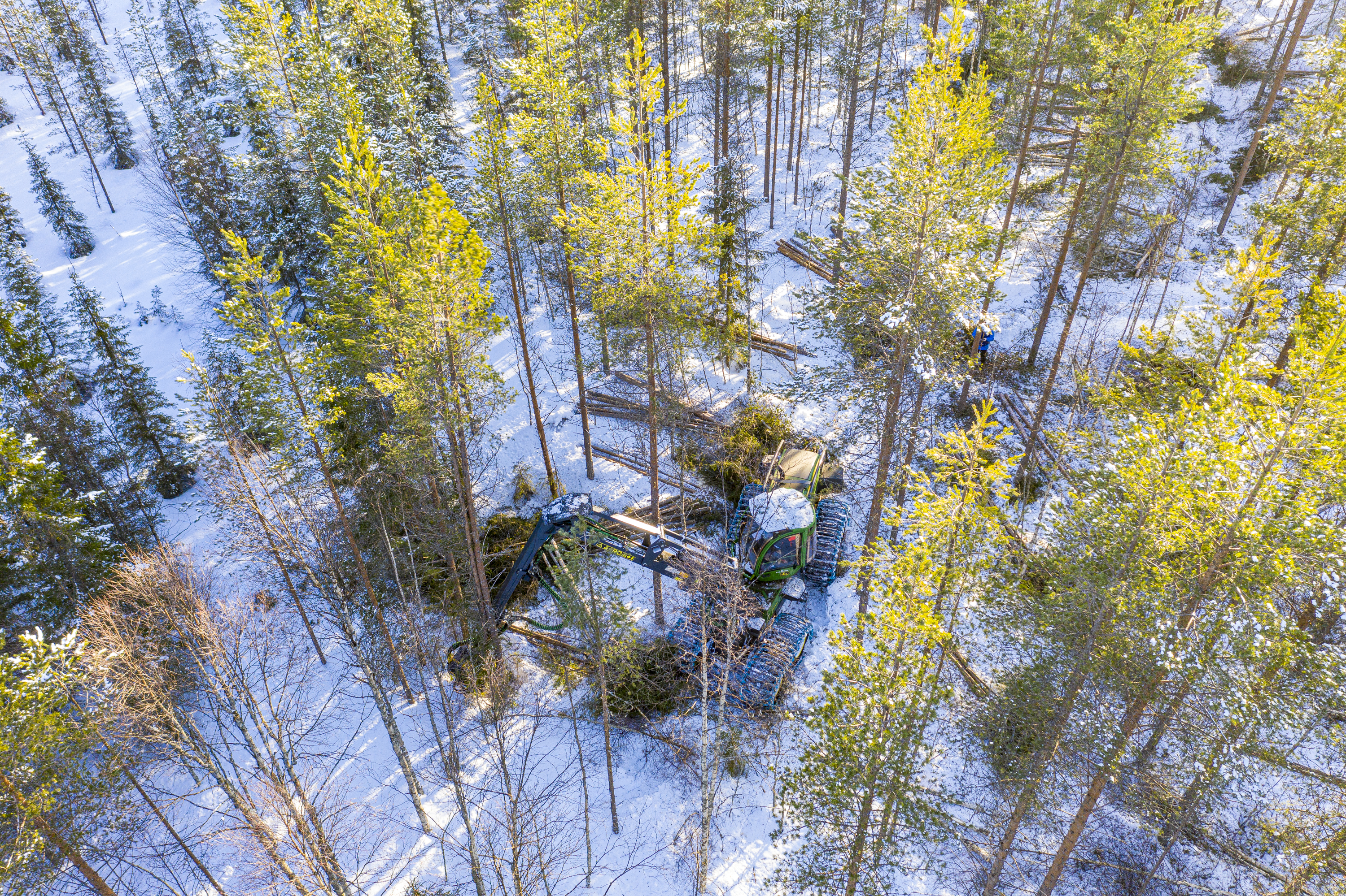 - Beskrivning: Avverkning, skördare, vinter, John Deere, drönarbild, flygfoto, ovanifrån