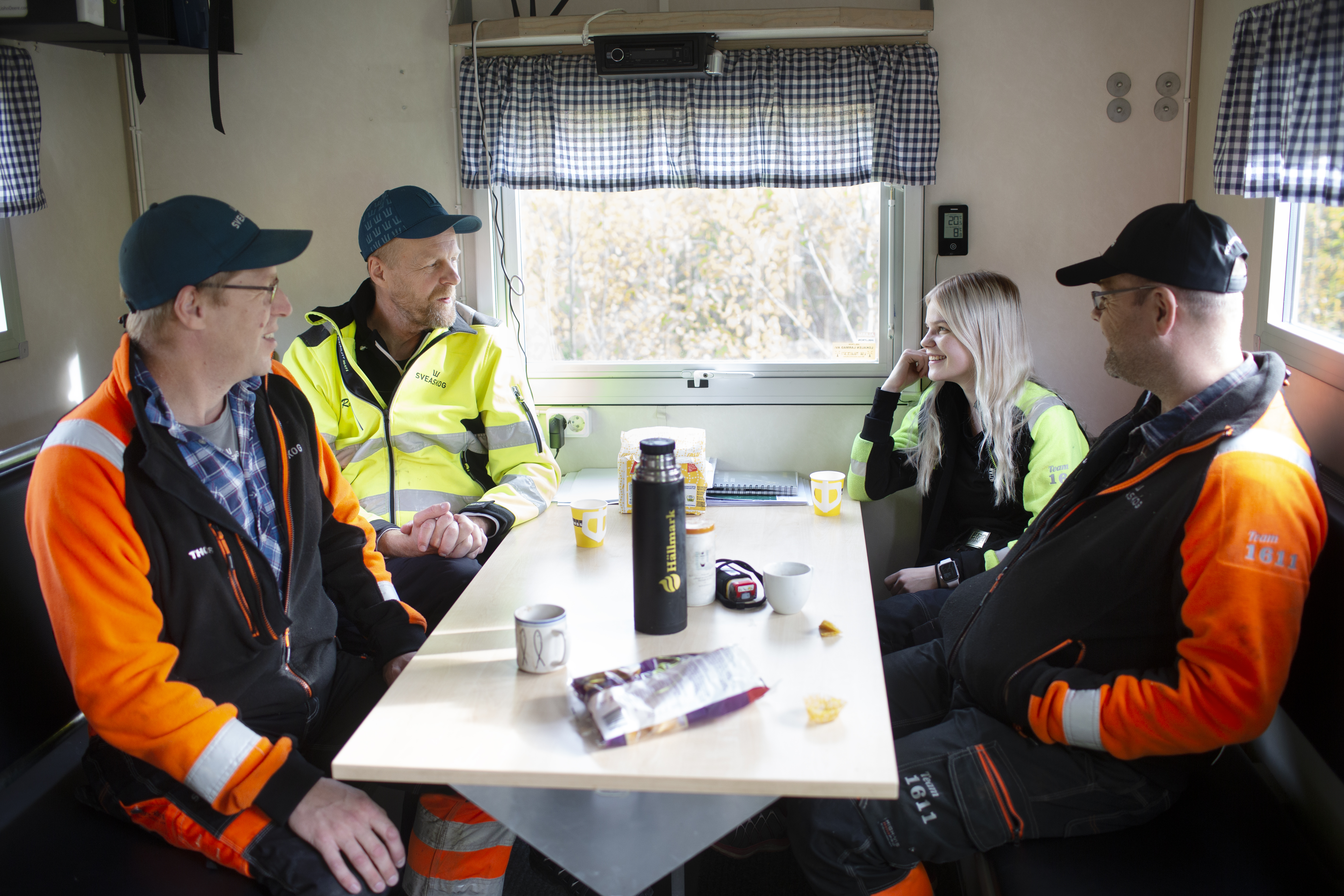 - Beskrivning: Thomas Johansson, Ragnar Lundström,Vera Wiippa och Anders Persson tar kafferast och pratar igenom dagens arbete. Ragnar Lundström är arbetsledare för laget som just nu gallrar i en skog utanför Överkalix.