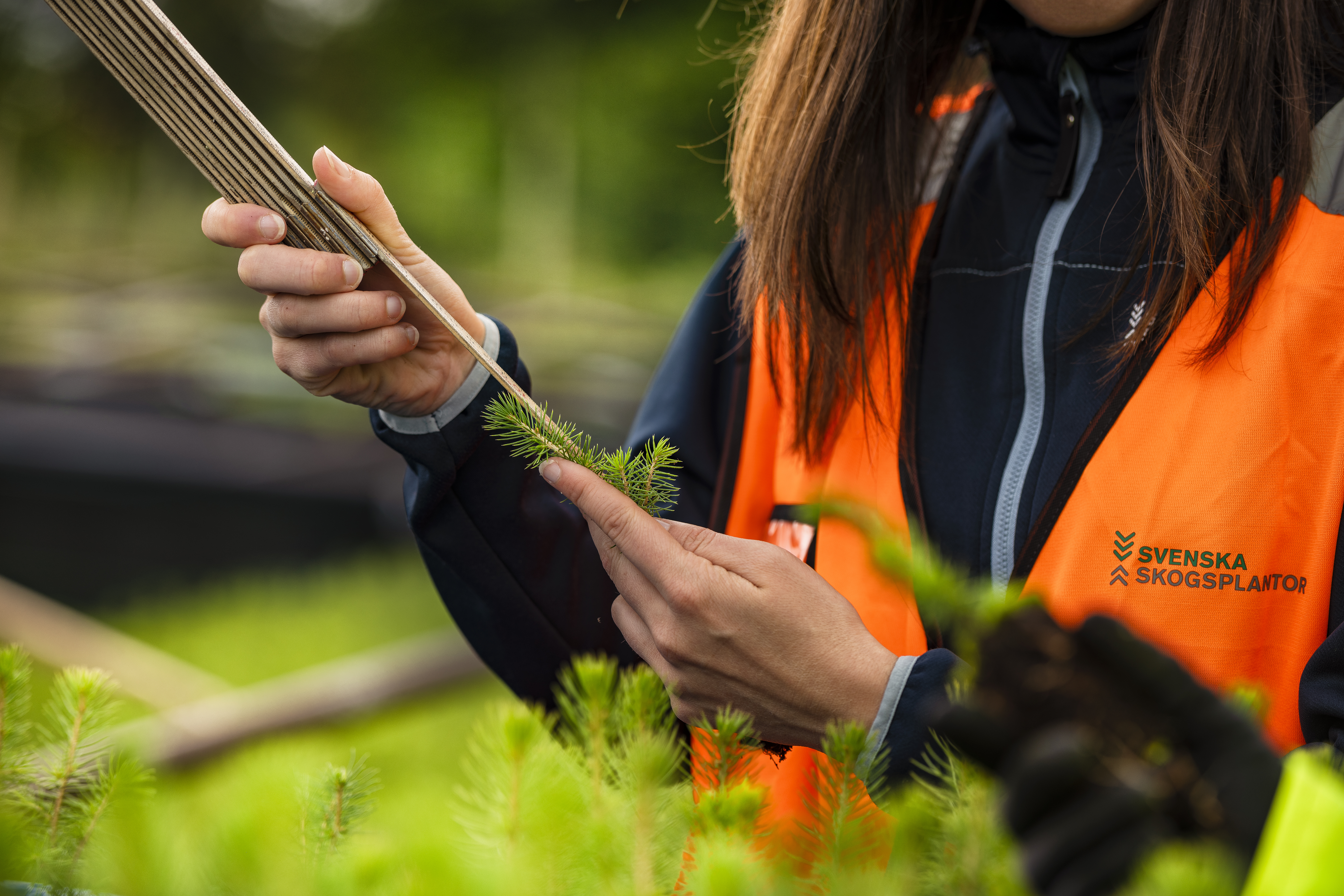• Beskrivning: Svenska Skogsplantor, plantskola, planta, mätning, tumstock, kvalitet