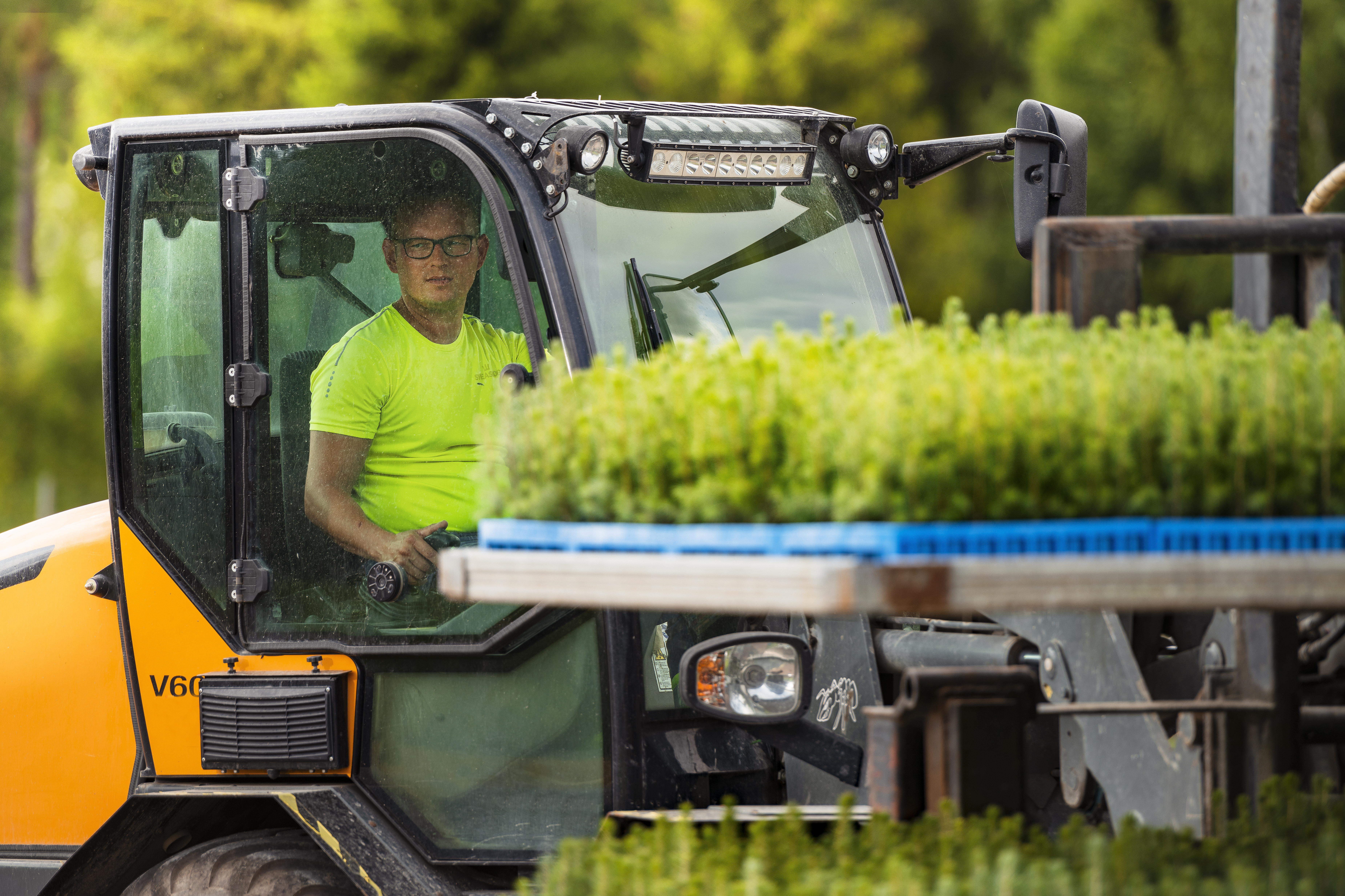 - Beskrivning: Svenska Skogsplantor, plantskola, truck, lastning av plantor