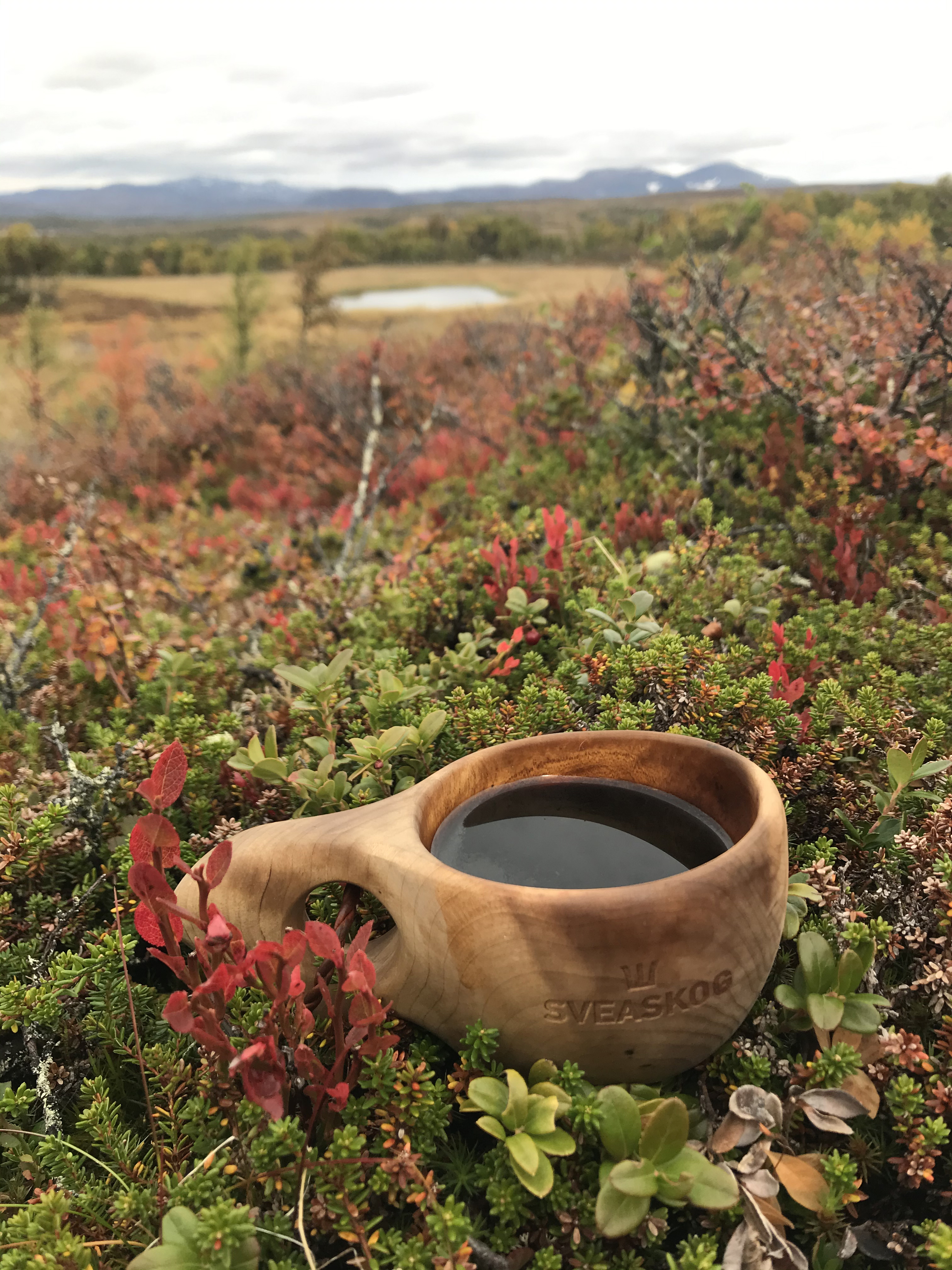 - Beskrivning: Kåsa med kaffe i fjällen, Sveaskogs logotyp, lingonris, paus, fika, kaffepaus
