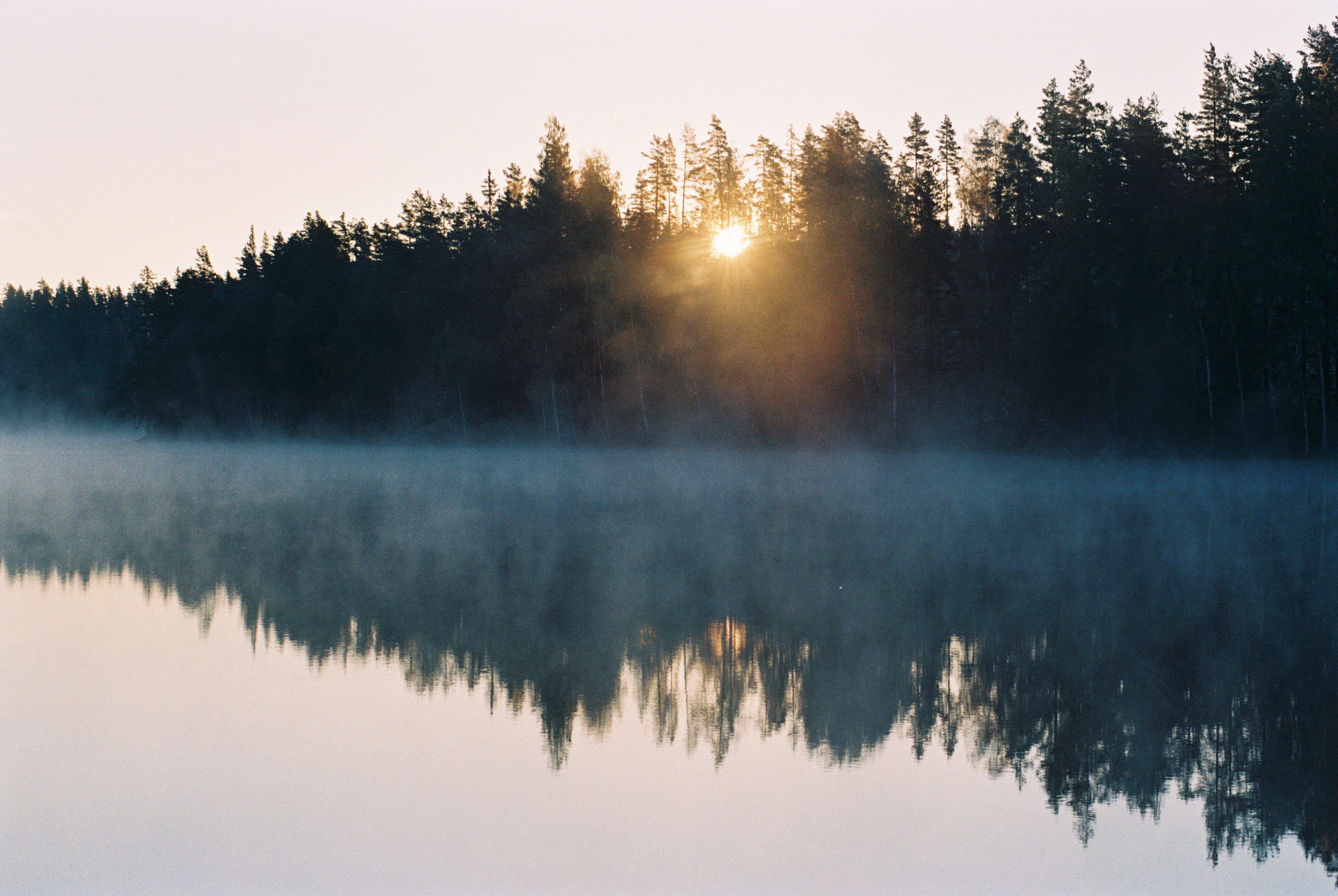 - Beskrivning: Soluppgång över sjö, dis, dimma.