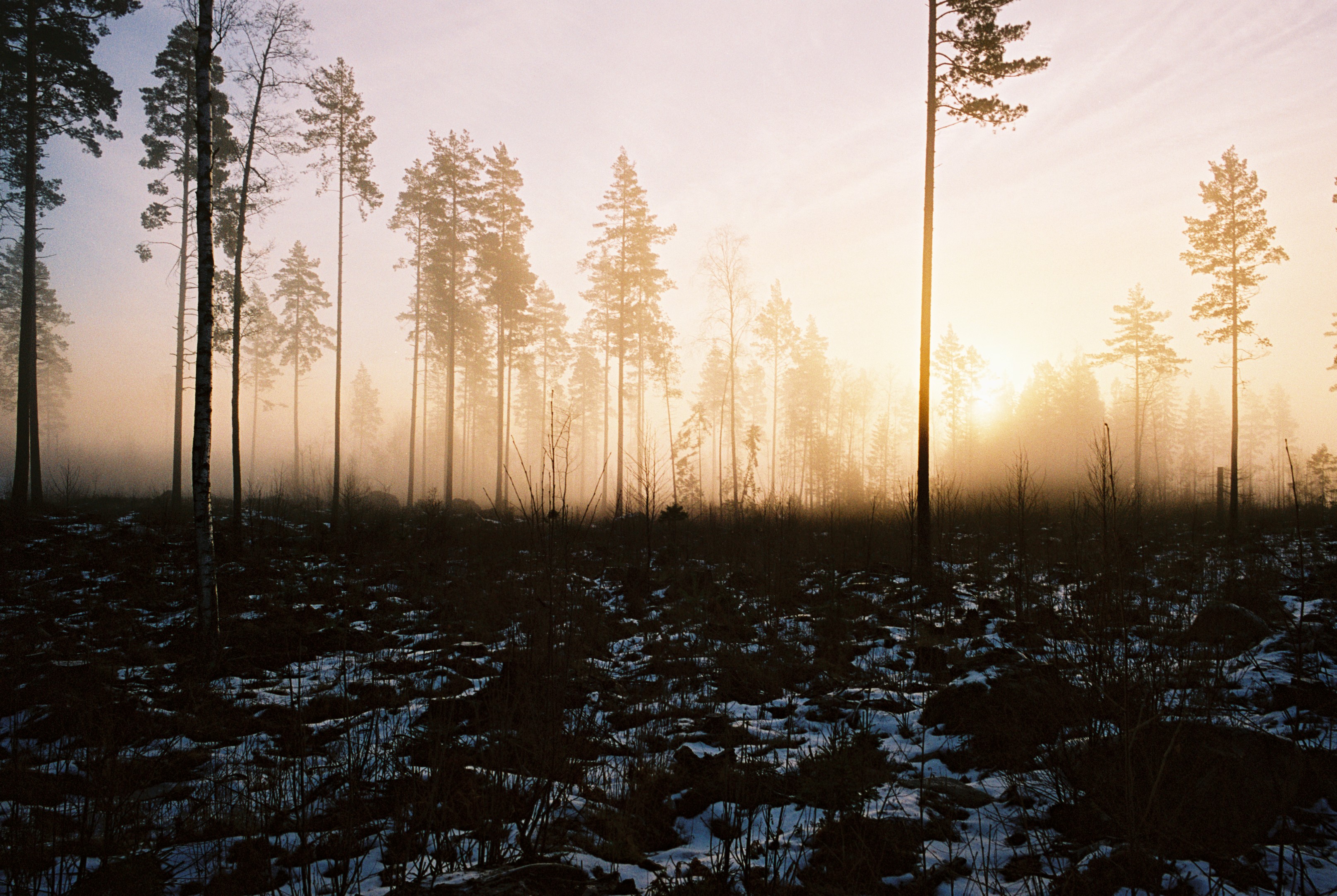 - Beskrivning: Tallar på hygge i morgondimma