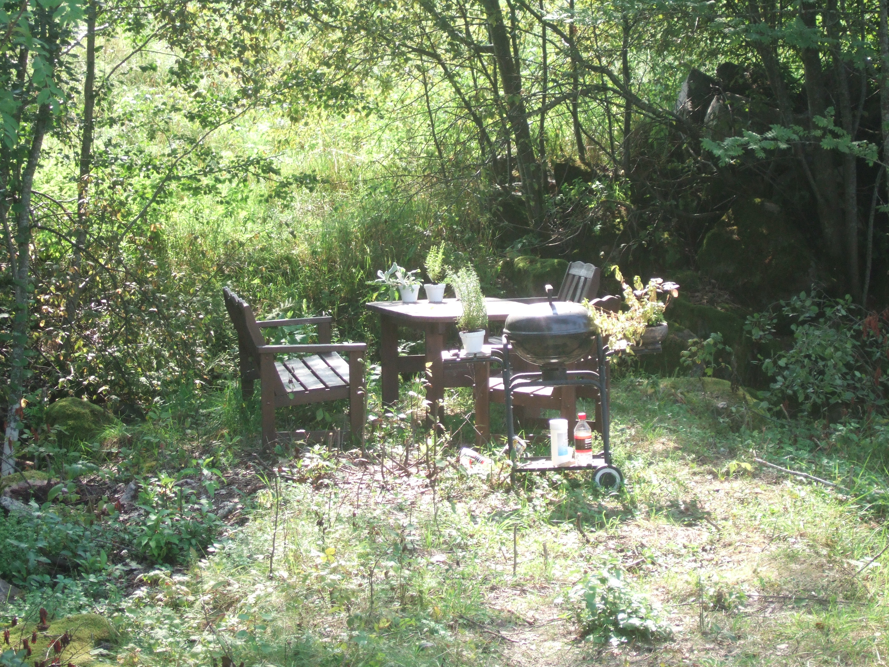 - Beskrivning: Grupp med trämöbler och grill ute i skogen
