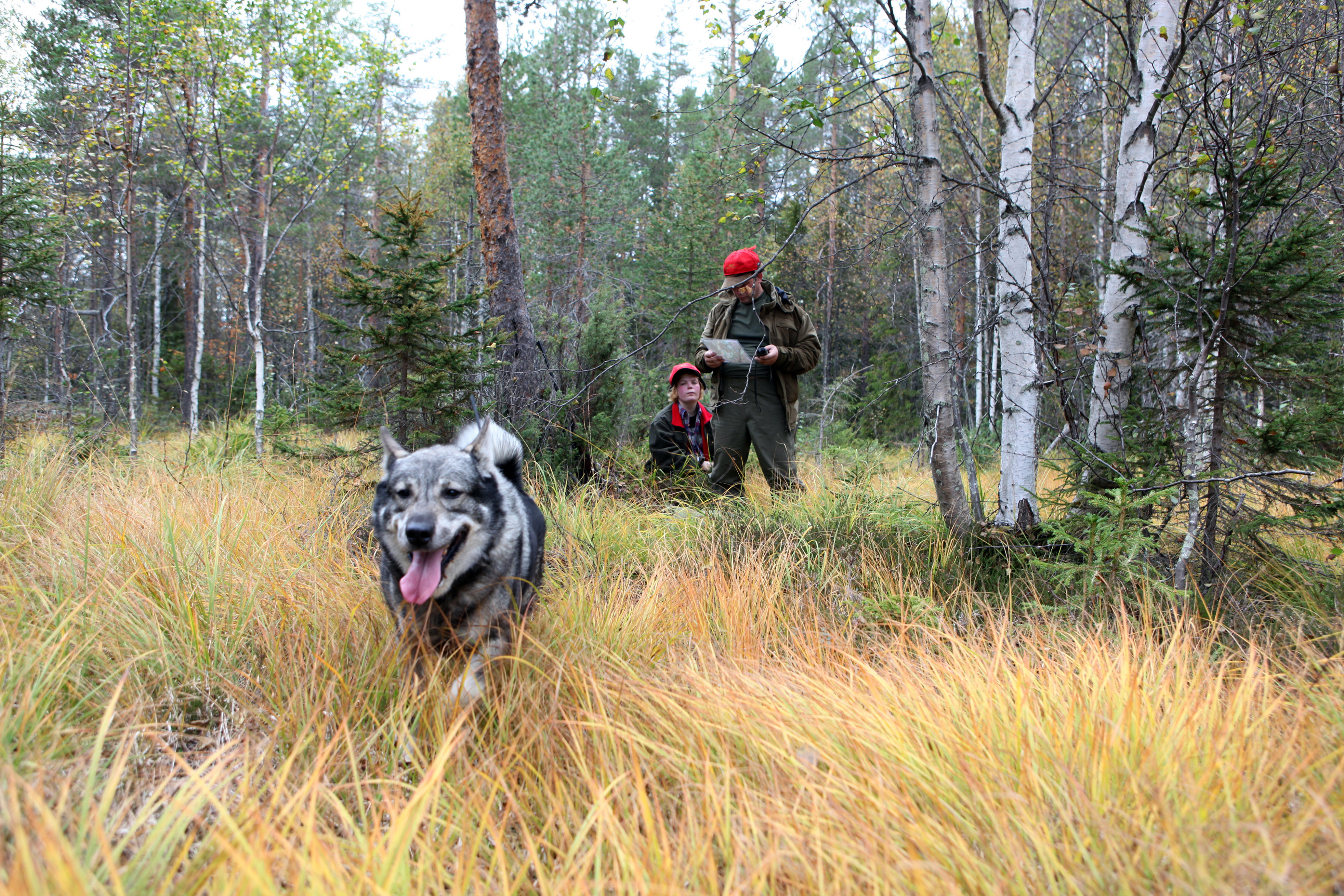 - Beskrivning: Älghunden Boss på höstens första jakt. Här med Pernilla Löf och hennes pappa Ronny Löf.