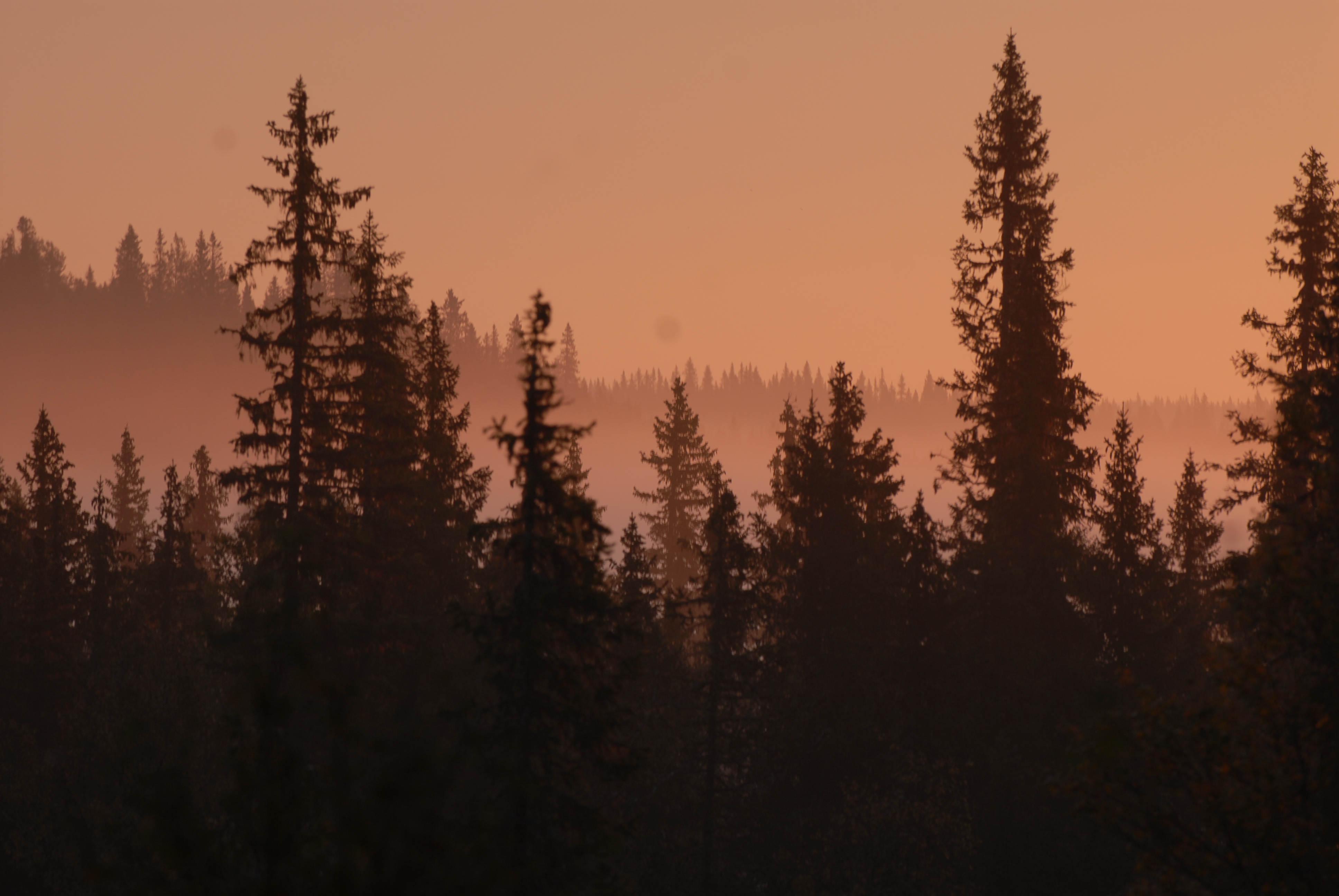 - Beskrivning: Skogslandskap i dimma, soluppgång, gryning