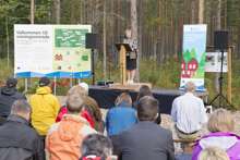 Beskrivning: Landshövdingen Västerbotten Magdalena Andersson inviger visningsområdet, Invigning av visningsområde för uthålligt skogsbruk, strax utanför Umeå, skog, klimat, miljö, projektet SKM, åhörare, besökare