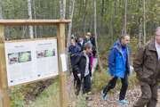Beskrivning: Informationstavlor beskriver de olika stationerna runtom i visningsområdet, Invigning av visningsområde för uthålligt skogsbruk, strax utanför Umeå, skog, klimat, miljö, projektet SKM