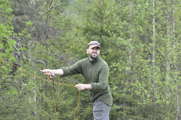 Beskrivning: Mimmi Persson på älgpass i höstig skog
