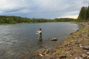 Beskrivning: Gädda, fiske vid Vindelälven uppströms Krokforsen