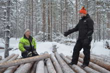 Beskrivning: logistik, virkesbil, lastbil, leverans, transport, timmertransport, transportering av virke, Brattby såg exkursion, samarbete mellan Sveaskog och Brattby Sågverks AB, trä, produkter och tjänster,